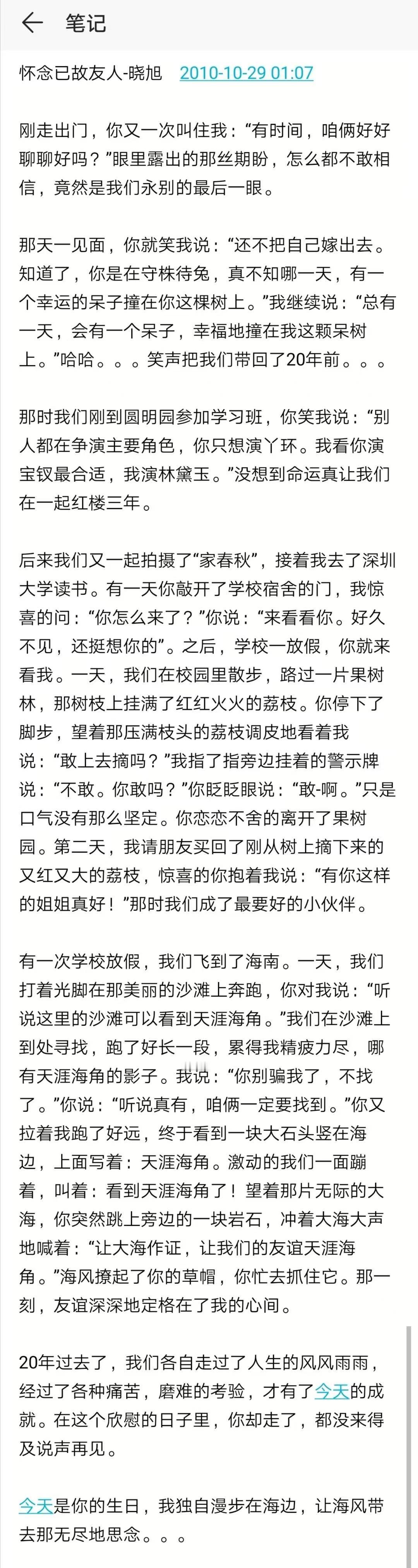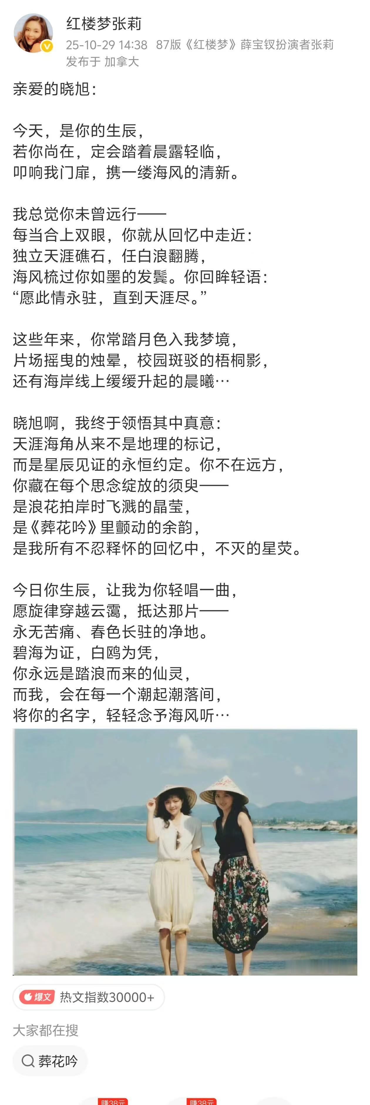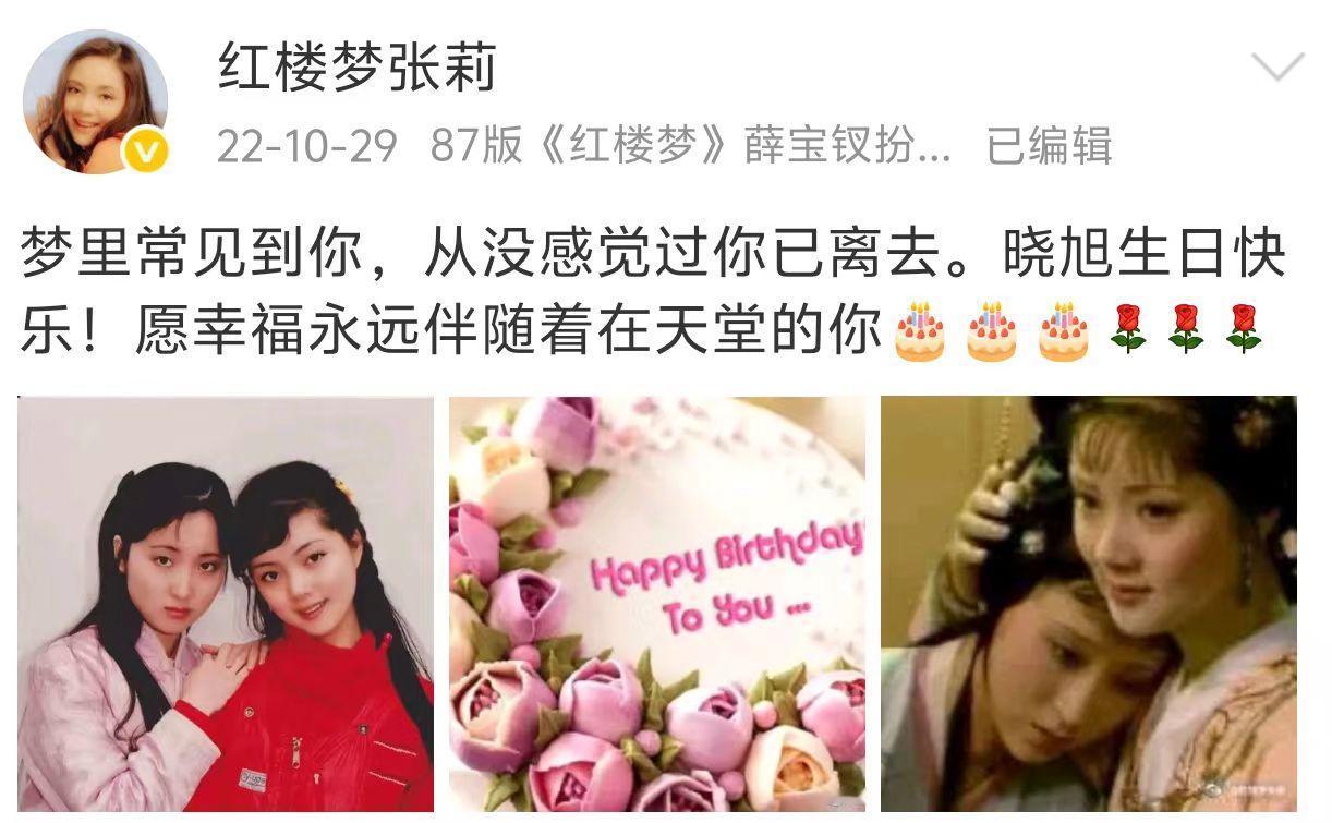张莉和陈晓旭在拍摄《红楼梦》期间结下深厚的友谊。陈晓旭去世后,张莉几乎每年都会在陈晓旭的冥诞和忌日发文悼念,文字情真意切令人动容。
