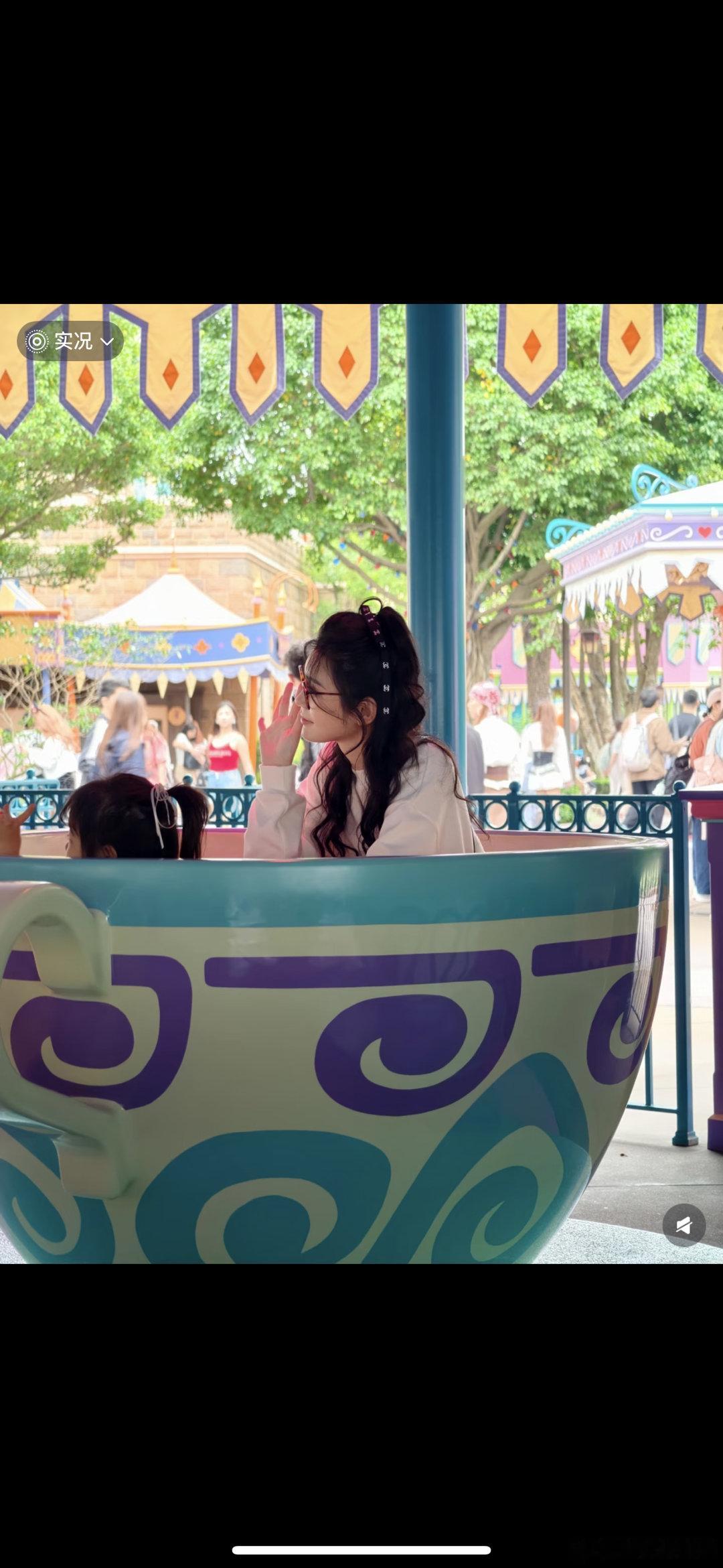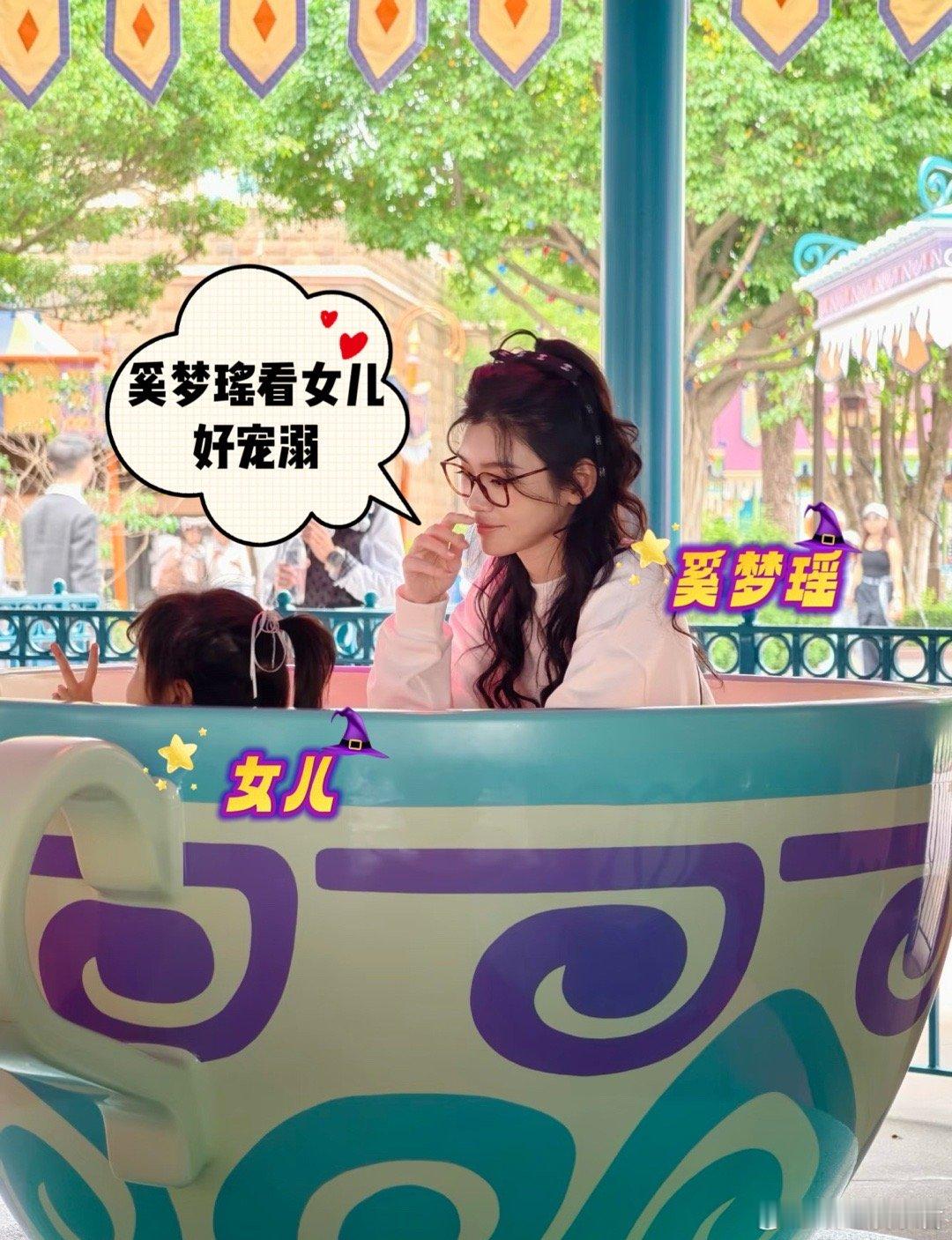奚梦瑶带女儿来迪士尼玩,小公主扎着马尾,比着剪刀手拍照很活泼,奚梦瑶看女儿眼神好宠溺奚梦瑶