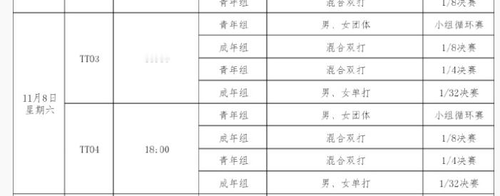 好我们来看11月8日晚场包括了多少场次(P2),答案是青年男团+女团+成年混双+青年混双+成年男单1/32+成年女单1/32,共计6场比赛,每个官方预估1小时,那么很明显男女团1小时未必够。