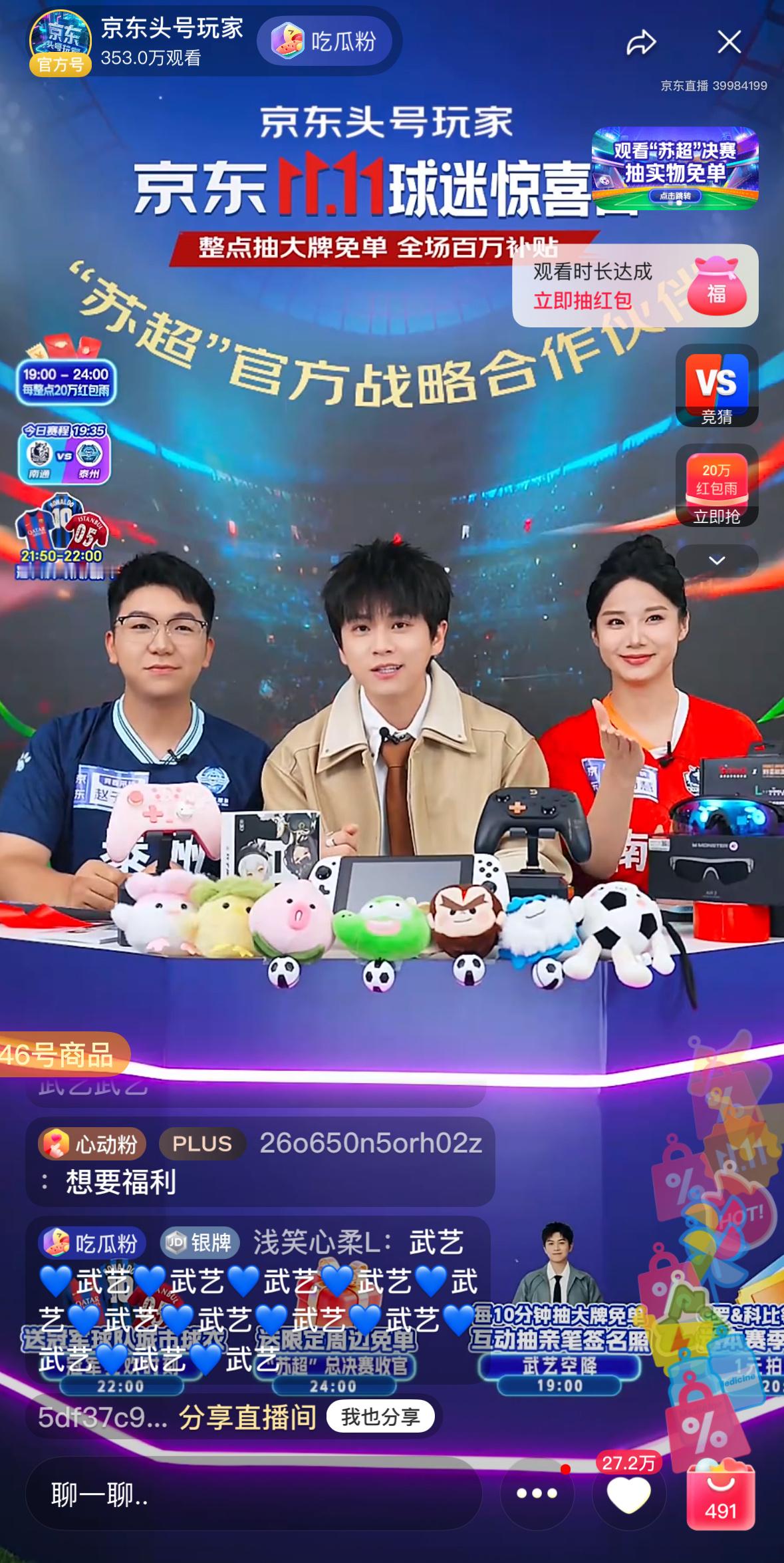 更惊喜的是,晚7点武艺会空降京东头号玩家直播间陪大家唠球,追星看球两不耽误!快搬好小板凳,见证冠军诞生。