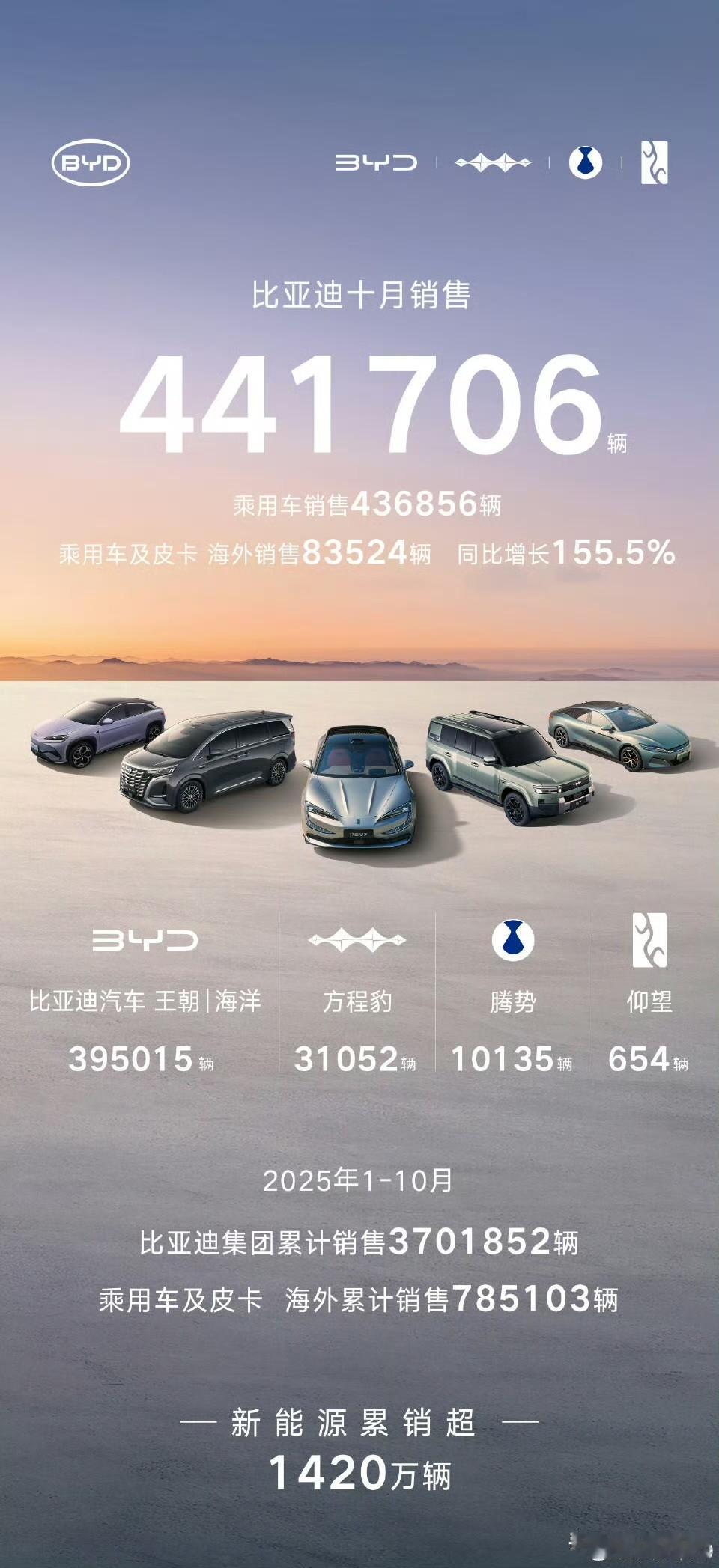 比亚迪:“兄弟们,大事不好!” 友商:“??” 比亚迪:“10月卖了502657辆,又搞了月销新纪录啊!前10个月累计销量也已经超过325万辆,照这趋势,我今年必突破400万!” 友商“……” 咱先看看具体数据,王朝和海洋两大系列还是主力军,10月卖了483437辆。像海鸥、秦L DM-i、海豹06这些车型,月销量都超过3万辆,性价比那是相当高,消费者都抢着买。方程豹虽然目前只有豹5在售,但也卖出了6026辆,在新能源越野车领域算是站稳脚跟了。腾势品牌10月销量10781辆,腾势Z9 GT上市后热度很高,带动了整体销量。还有仰望,作为百万级豪车品牌,10月也卖了282辆,仰望U8还是主力,卖了265辆。 不得不说,比亚迪这几年发展太猛了,技术不断创新,车型也越来越丰富,从经济型到豪华型,啥都有。而且比亚迪的供应链也很稳定,在芯片短缺的大环境下,它还能保持这么高的销量,真的很厉害。我觉得比亚迪能有今天的成绩,靠的就是对技术的坚持和对市场的精准把握。