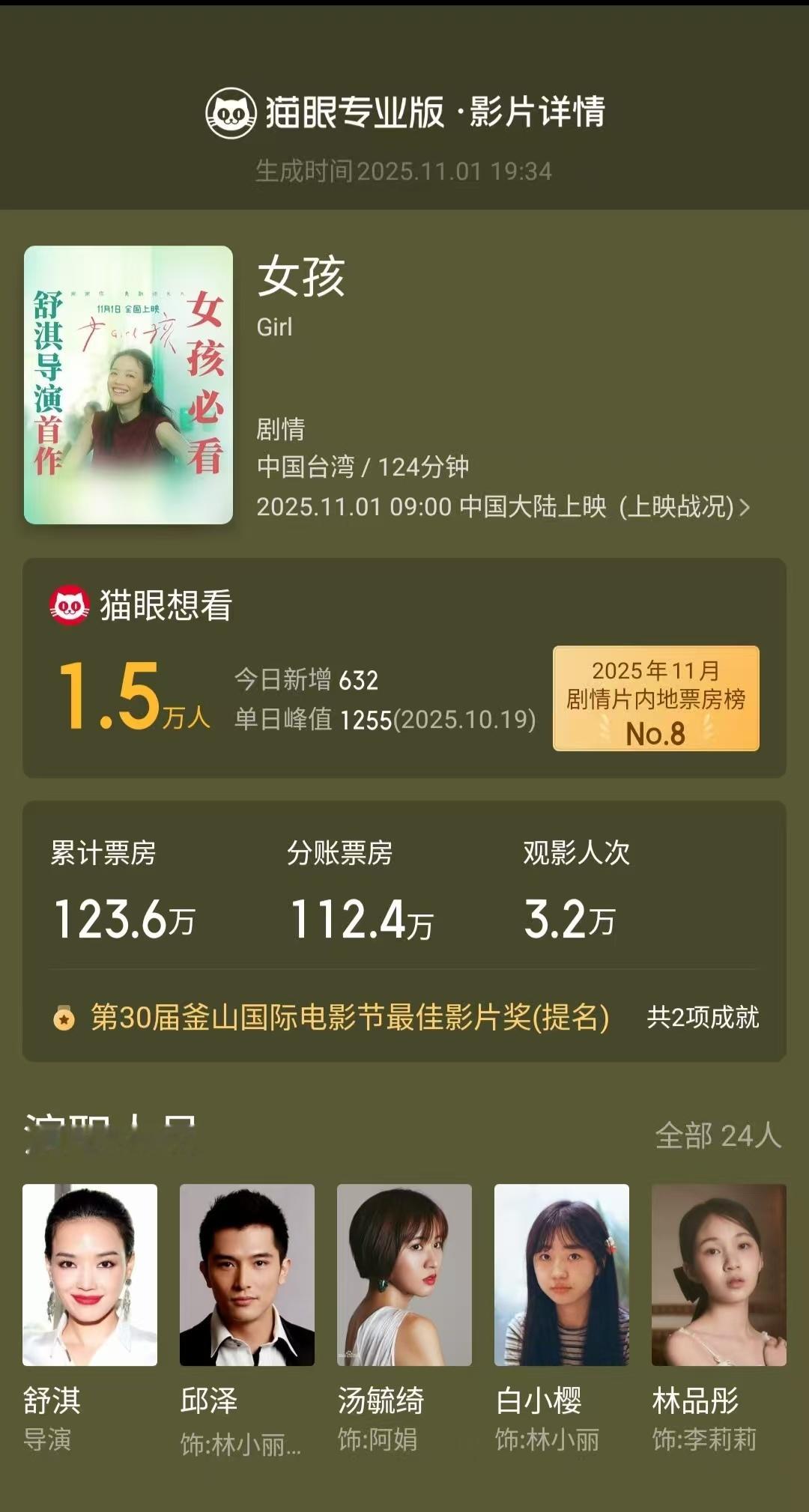 汪苏泷[超话]汪苏泷包场支持舒淇导演首作女孩 据猫眼专业版云包场显示,包场支持编剧导演首作《女孩》,🔥影片正在热映中!🎬光影传递善意,❤️真诚书写女孩成长,☀️愿每一段回望都能长出新的力量!汪苏泷包场支持女孩