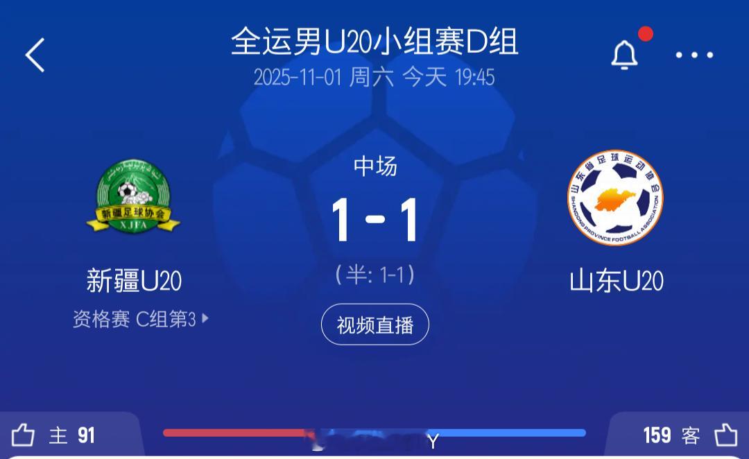山东泰山[超话]u20 新疆 vs u20山东u20 新疆vs 山东u20 目前比分1比1 彭啸扳平比分