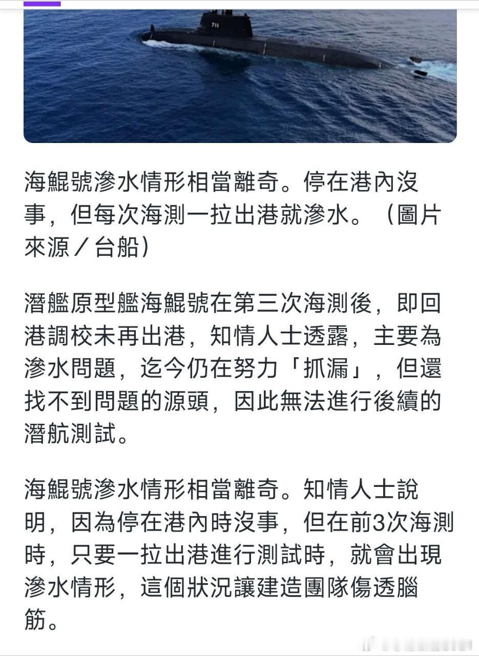 中国台湾海鲲级潜艇出现渗水等质量缺陷。