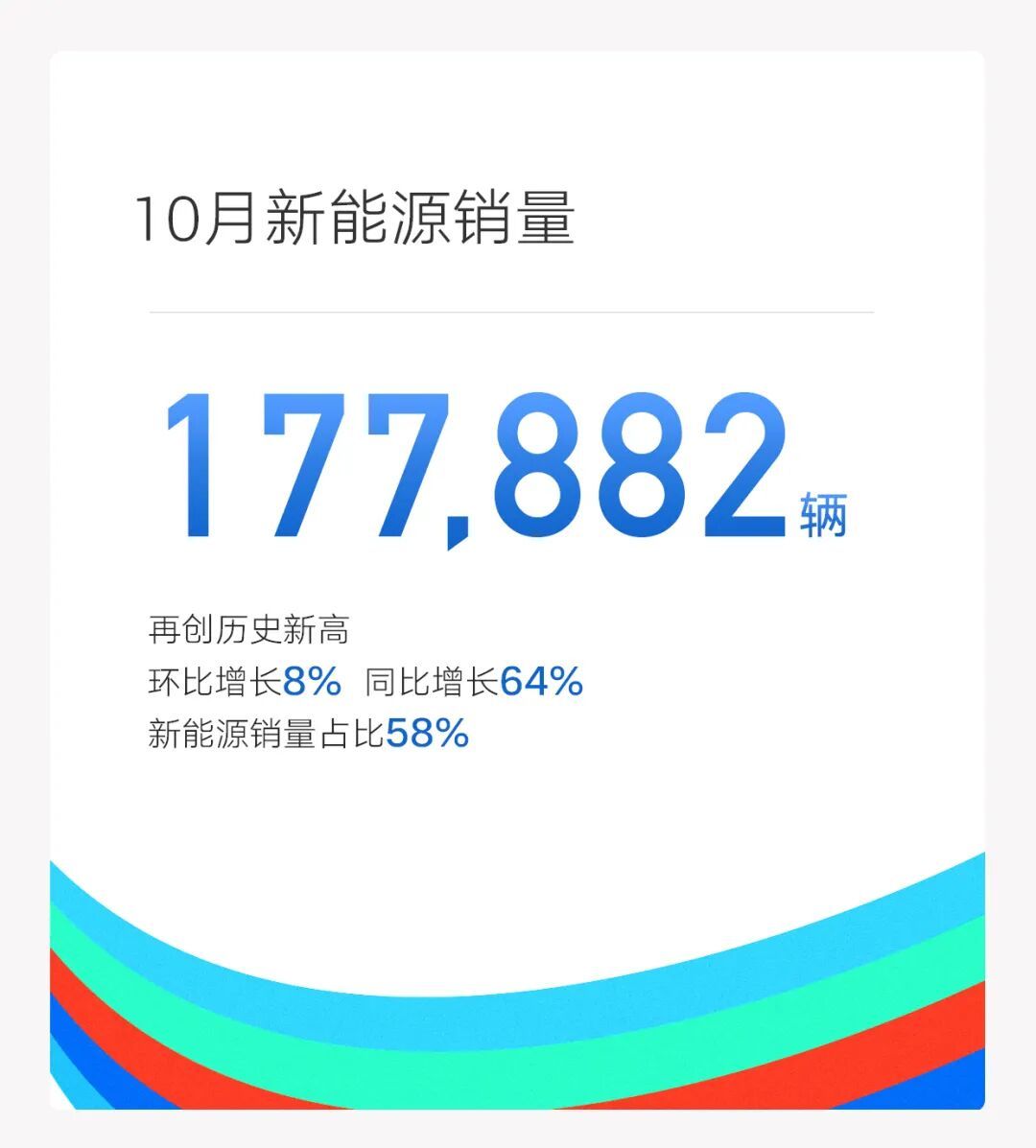 据官方信息显示,吉利汽车10月销量307133辆,新能源销量177882辆。连