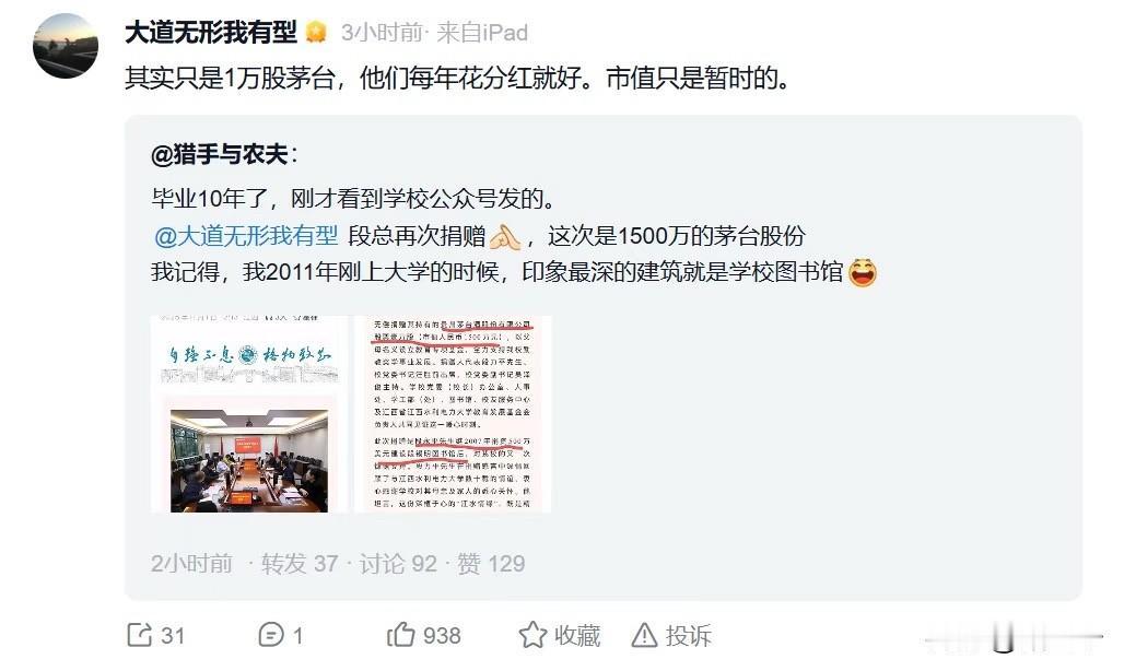 段永平向江西水利电力大学捐1万茅台股份! 为毛大家还喊小气? 市值有1500万, 每年股票分红约在40-50万! 段永平也在社交上言明: 其实只是1万股茅台,它们每年花分红就好,市值只是暂时的。 高校不乏优秀校友设立奖学金, 但往往有些校友事业起落资金供给不稳, 学校又不好意思上门催款。 段永平这种做法是非常棒的: 茅台股息率稳定, 相当于每年有一笔稳定资金流入。 至于多少的问题, 有这份心就好, 总不能拿1500万和他的百亿身家说事, 普通毕业生给母校捐1000块都难! …