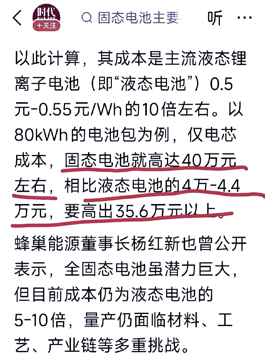 不是因为固态电池量产时间太晚,也不是因为续航没有突破3000公里,而是早期生产成本太高,装在车上会导致车价飙升。有媒体报道,仅仅是续航1000公里的固态电池,生产成本就高达40万,比相同续航的液态电池贵了10倍以上,所以大家可以想象一下续航两三千公里的固态电池,生产成本会有多吓人。