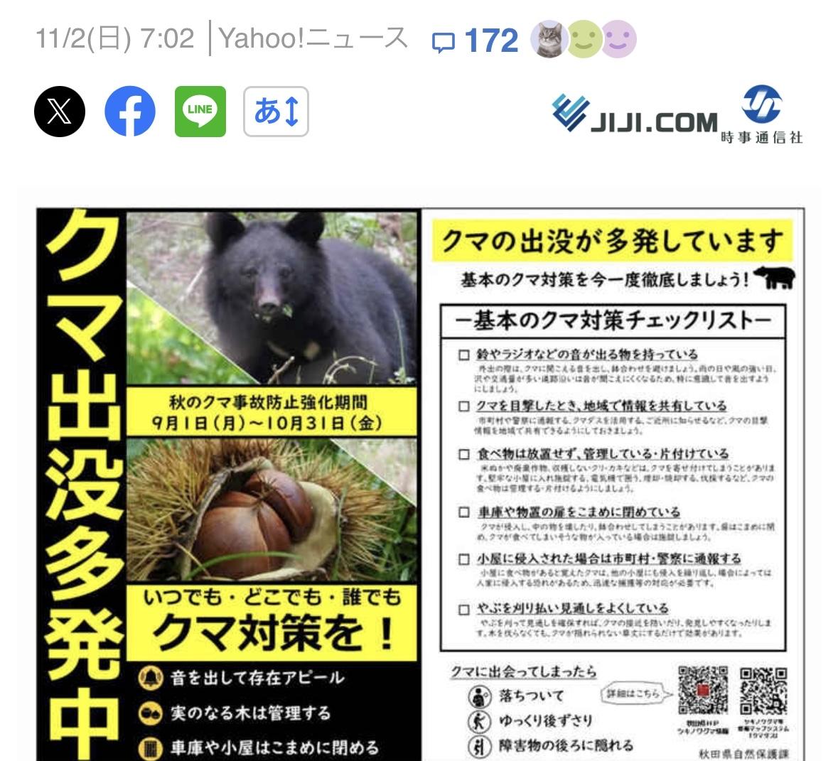 出门带把结实的雨伞,遇熊防身!今年截止到10月30日北海道、秋田、岩手、宫城、长