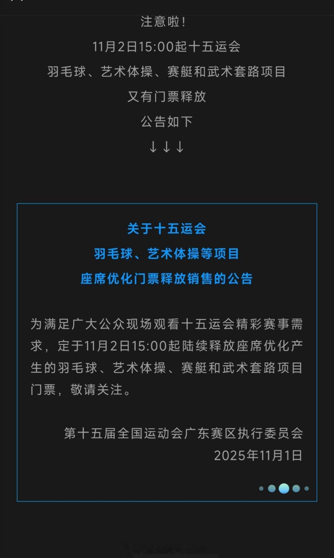 11月2日15:00起陆续释放座席优化产生的羽毛球、艺术体操、赛艇和武术套路项目门票,敬请关注。