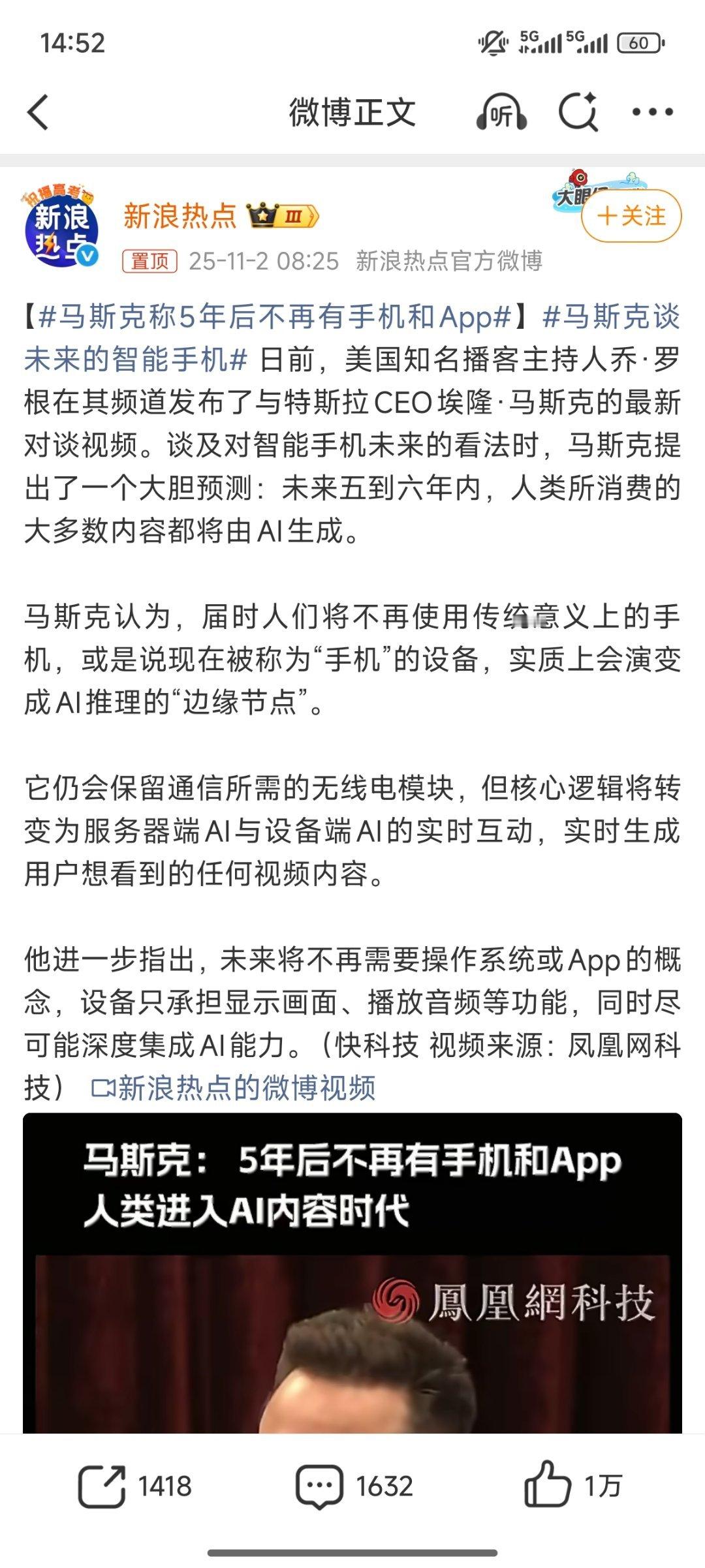马斯克称5年后不再有手机和App