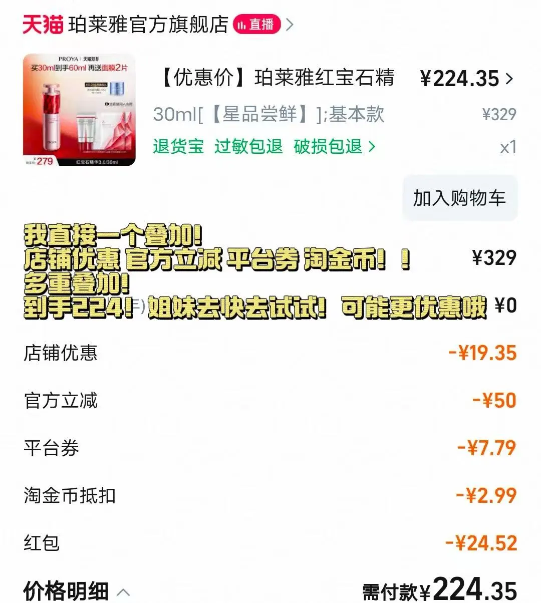 搜“美妆惊喜盒子”还能领品类券,这款珀莱雅红宝石面霜我是给自己买的,叠加抵扣券下来只要224.35,省了我100多,哈哈哈哈!!
