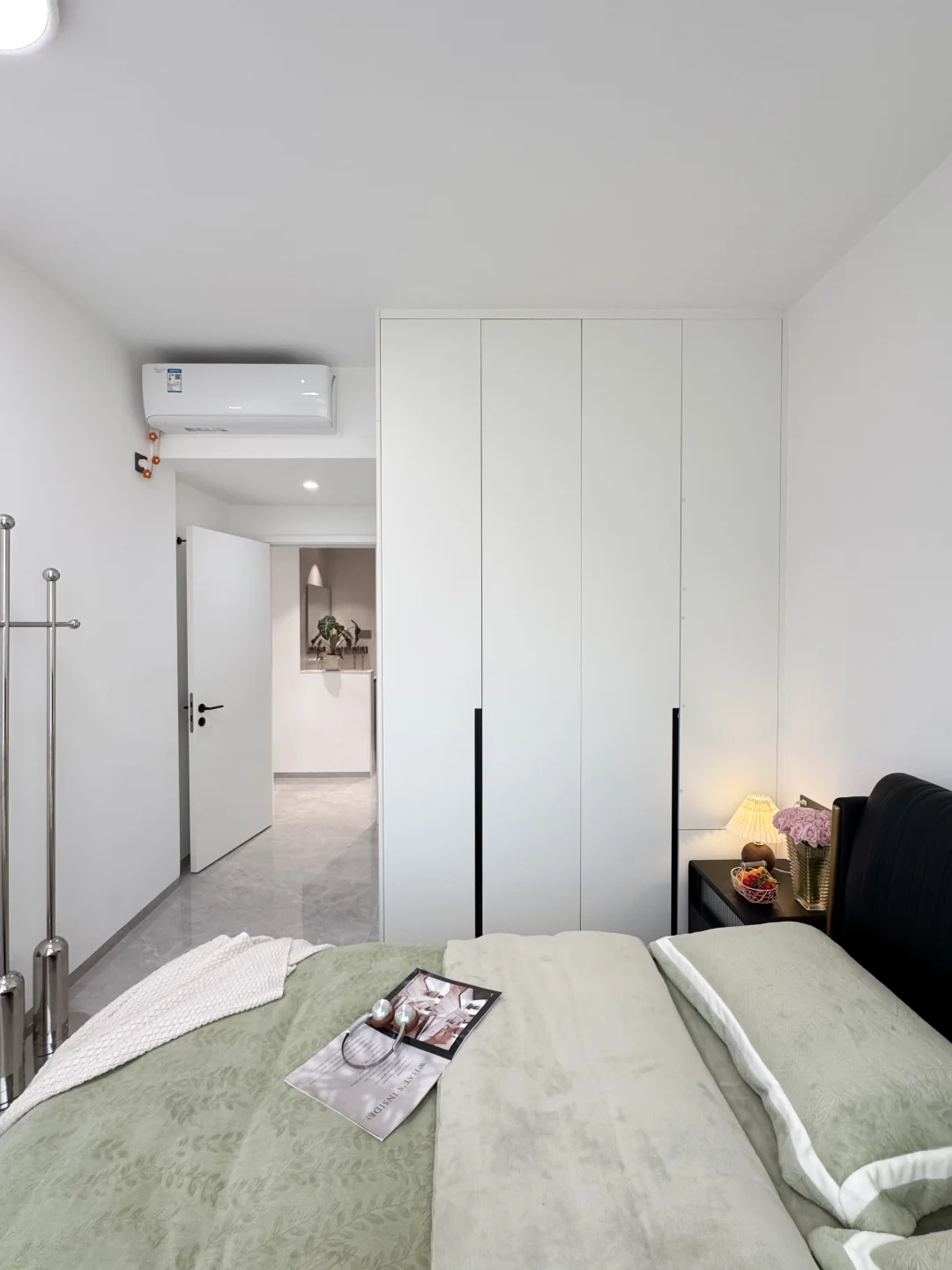 10平主卧依然延续了全屋的黑白灰配色,干净利落、静谧又温柔。