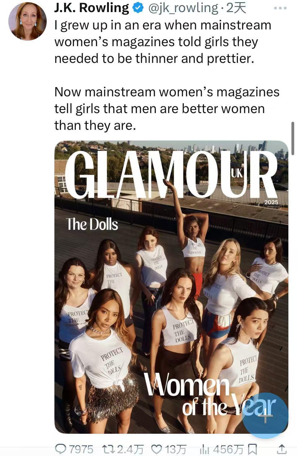 J.K.罗琳再度发声,批评《Glamour UK》杂志将跨性别女性纳入“年度女性”评选。
