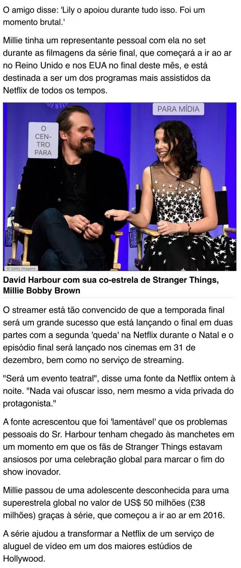《每日邮报》报道:米莉·波比·布朗在《怪奇物语》最后一季开拍前对大卫·哈伯提出骚扰与霸凌投诉,指控内容长达数页,包括不当性行为。米莉在拍摄《怪奇物语》最终季期间,个人代表陪同在片场。
