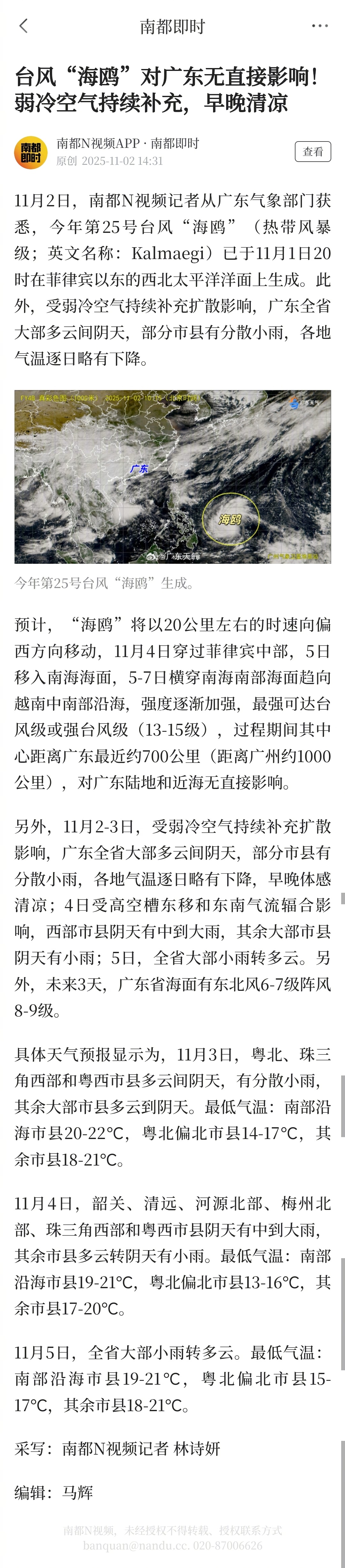 #新台风生成对广东无直接影响#【台风“海鸥”对广东无直接影响!弱冷空气持续补充,早晚清凉】#弱冷空气补充广东早晚清凉#11月2日,南都N视频记者从广东气象部门获悉,今年第25号台风“海鸥”(热带风暴级;英文名称:Kalmaegi)已于11月1日20时在菲律宾以东的西北太平洋洋面上生成。此外,受弱冷空气持续补充扩散影响,广东全省大部多云间阴天,部分市县有分散小雨,各地气温逐日略有下降。