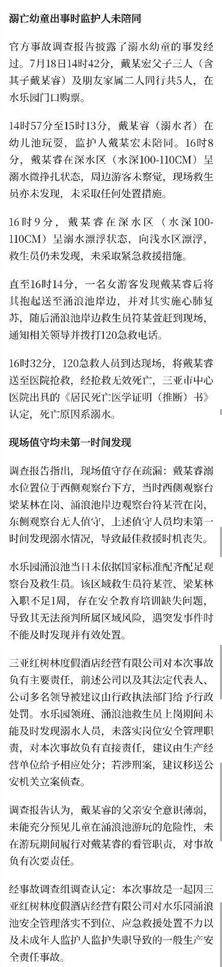 4岁幼童在涌浪池溺水6分钟无人察觉幼童溺水6分钟无人察觉,暴露的是公共游乐场所的安全漏洞与责任虚浮。本应守护安全的救生员形同虚设,东侧观察台无人值守,在岗者也未发现异常 。儿童溺水多是无声挣扎,本就依赖专业观察与及时救援。当盈利优先于安全配置,当培训走过场,再浅的水池也会变成致命陷阱,这样的安全漠视必须严惩。