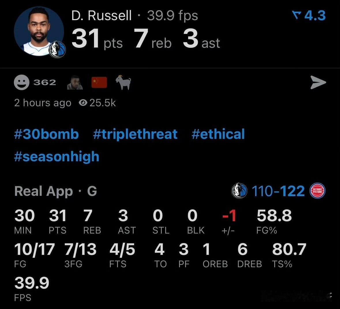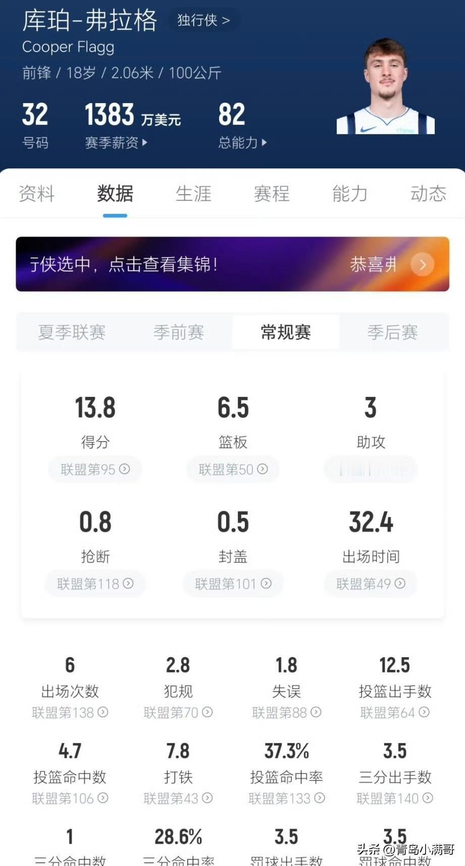 水拉真的不拉!!!拉塞尔砍31+7,这不给首发不合适吧! 水拉常规赛可以不拉的,独行侠休赛期拿下拉塞尔不就是想在欧文回来前让他打首发后卫,等欧文回来后他又能够甘心打替补的这么一个角色吗? 现在倒是好了,首发五个人没有一个正牌的控卫,反倒是想把弗拉格当字母哥培养,基德这是字母哥中毒了吧。 关键是弗拉格打控卫适应吗,应该是水土不服吧,看看他现在的表现,已经被埃奇库姆等人超越了,独行侠是不是迷失了方向。 今天,独行侠不敌活塞,或者说大败,首发五人没有一个人上20分,弗拉格最高16分,还是在14中3的惨淡命中率的情况之下拿到的,而替补席的拉塞尔呢,人家31分7篮板,三分命中率超5成,是不是考虑给个首发机会呢? 拉塞尔 拉塞尔里夫斯 独行侠 达拉斯独行侠