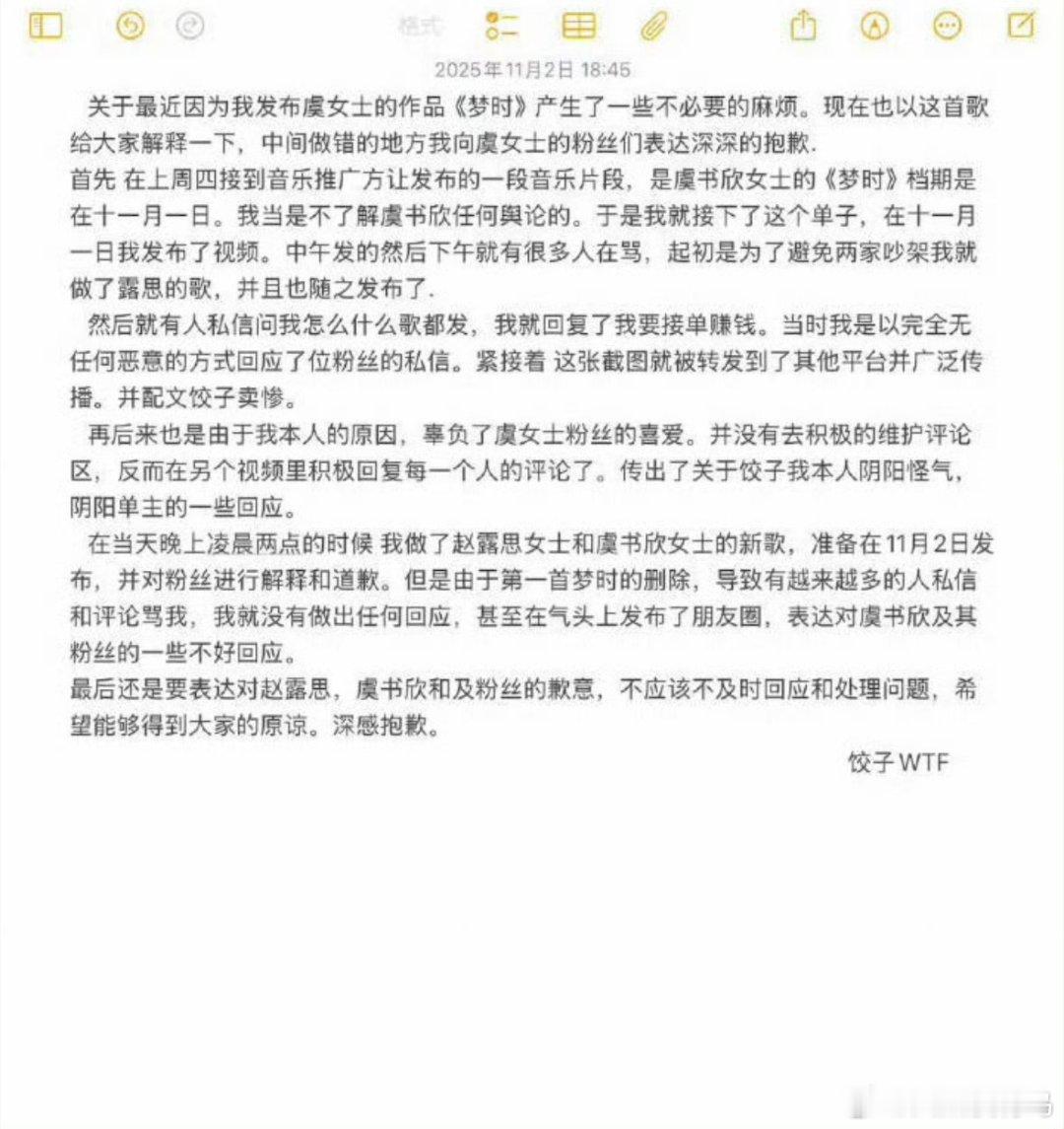 雪球音乐发声明了撤销和饺子合作,另外给虞书欣和虞书欣粉丝道歉了