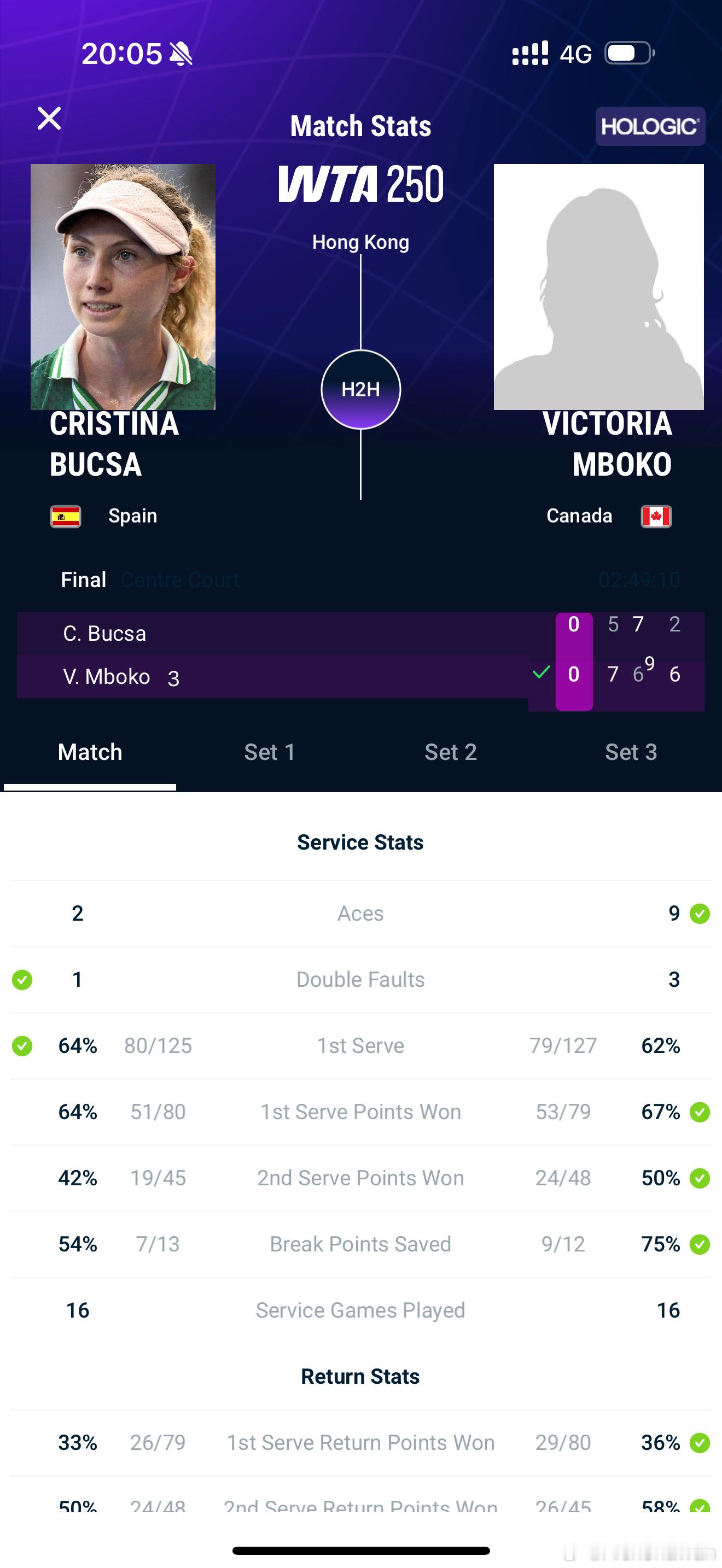 香港250赛决赛,赛会3号种子、21岁的加拿大好手姆博科7比5、6比7、6比2完胜西班牙选手布克沙,摘得冠军,也是职业生涯第二冠(2025辛辛那提)。