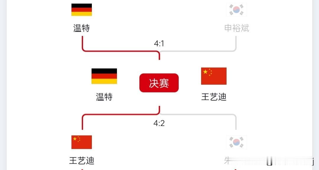 王艺迪不负众望,半决赛4:2战胜朱芊曦杀进决赛。 胜利的过程也是惊险万分,先是以大比分2:0领先,结果朱芊曦迅速调整心态和战术,把比分打成2:2平。 然后王艺迪也是进行重新调整状态拿下第五局,打成3:2领先。 在第六局,王艺迪差点被逆转,一度被朱芊曦领先拿到了局点,还好王艺迪稳住了局势,抓住机会连续得分,最终以12:10赢得比赛,以大比分4:2拿下半决赛,进入决赛。 在决赛,王艺迪将对阵另一半决赛的胜利者温特,王艺迪是否能够继续披荆斩棘,走向巅峰呢?让我们持续关注后续的巅峰对决吧!
