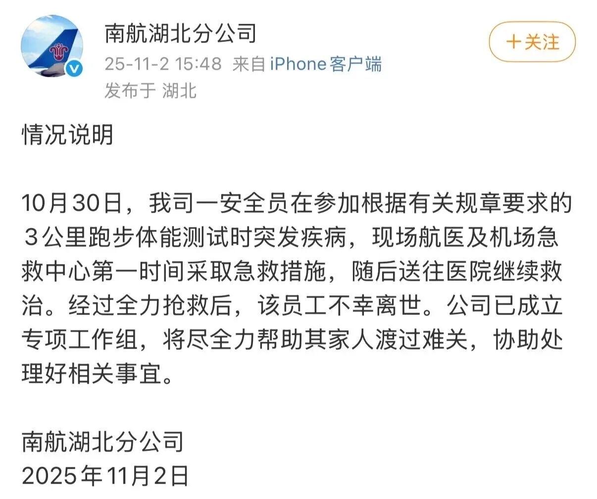 10月30日,南航湖北分公司通报“员工3000米体测猝死”事件引起热议! 网友各抒观点,有人说领导想一出是一出;也有人说:虽然很难过,但航空安全员对体能是有要求的,一但出事安全员没体力帮助乘客又会被吐槽等等! 总之,如果平时能多体检,多锻炼,或许能减少这种无谓的伤亡吧!