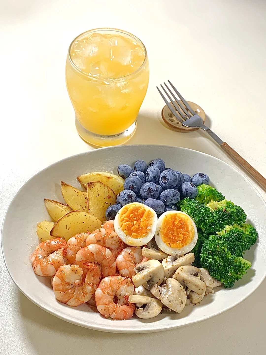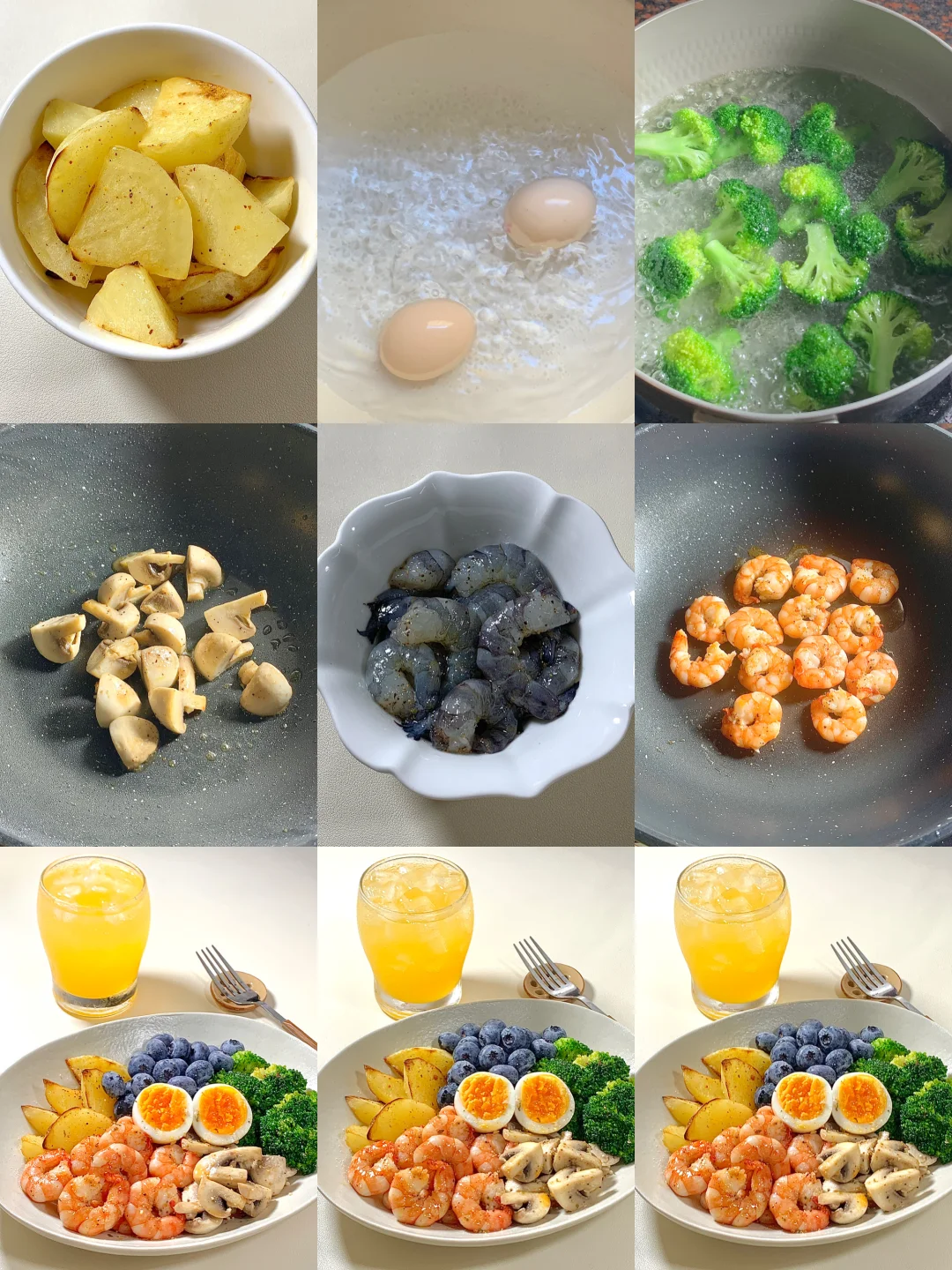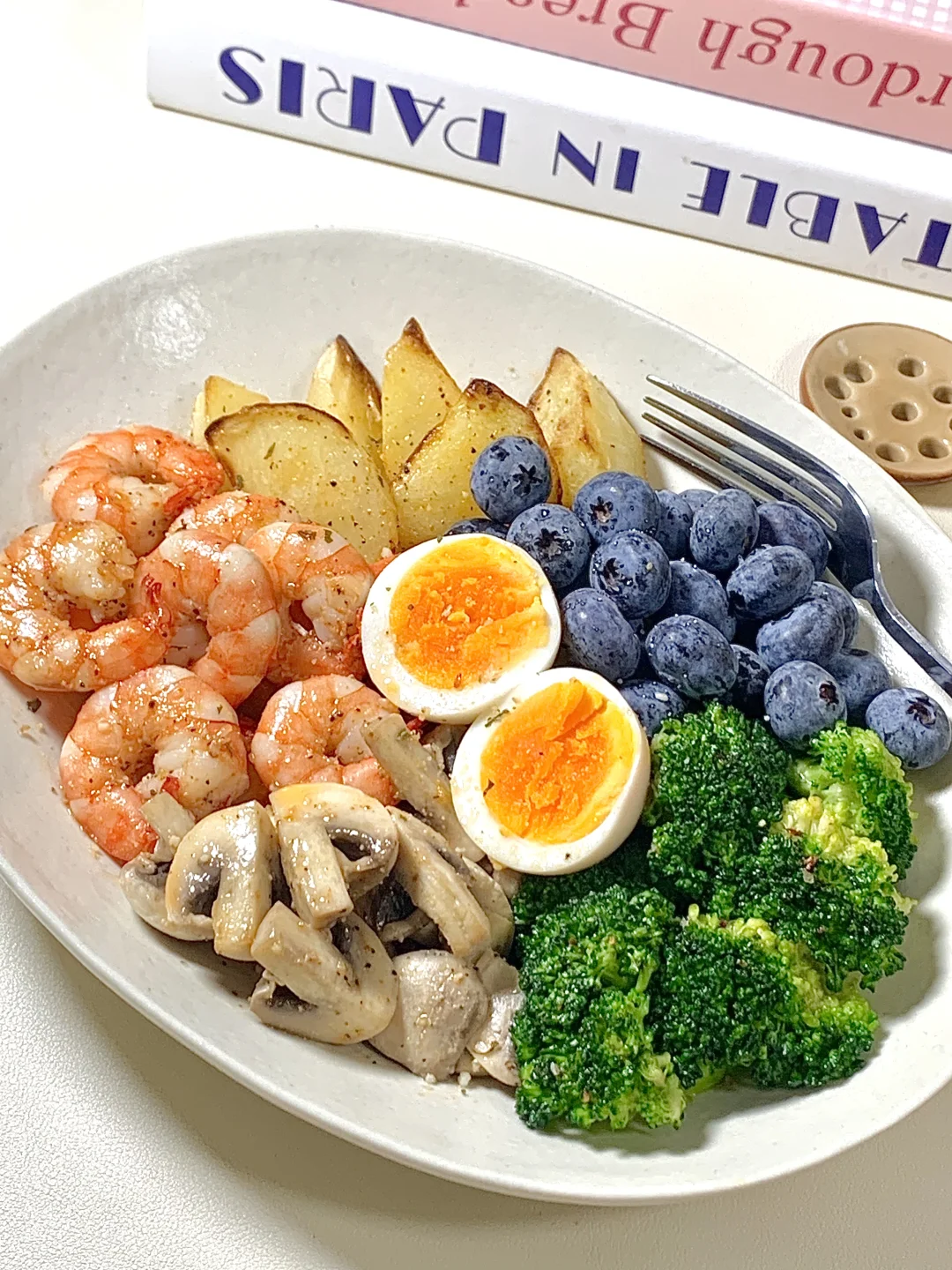 今日减脂餐虾仁溏心蛋拼盘!巨鲜美😋 📝食材:虾仁、鸡蛋、西兰花、土豆、口蘑、蓝莓 ✨做法: 1️⃣土豆滚刀切块 放入空气炸锅烤熟 2️⃣鸡蛋煮8分钟捞出过凉水 3️⃣锅里放适量水煮开 放西兰花焯水1分钟 4️⃣锅里喷油口蘑炒熟 5️⃣虾仁+黑胡椒盐腌制10分钟→起锅喷油倒入虾仁煎熟 🍃所有食材装入盘就可以开吃啦[色色R] 低卡低脂!姐妹们赶紧做起来[派对R]