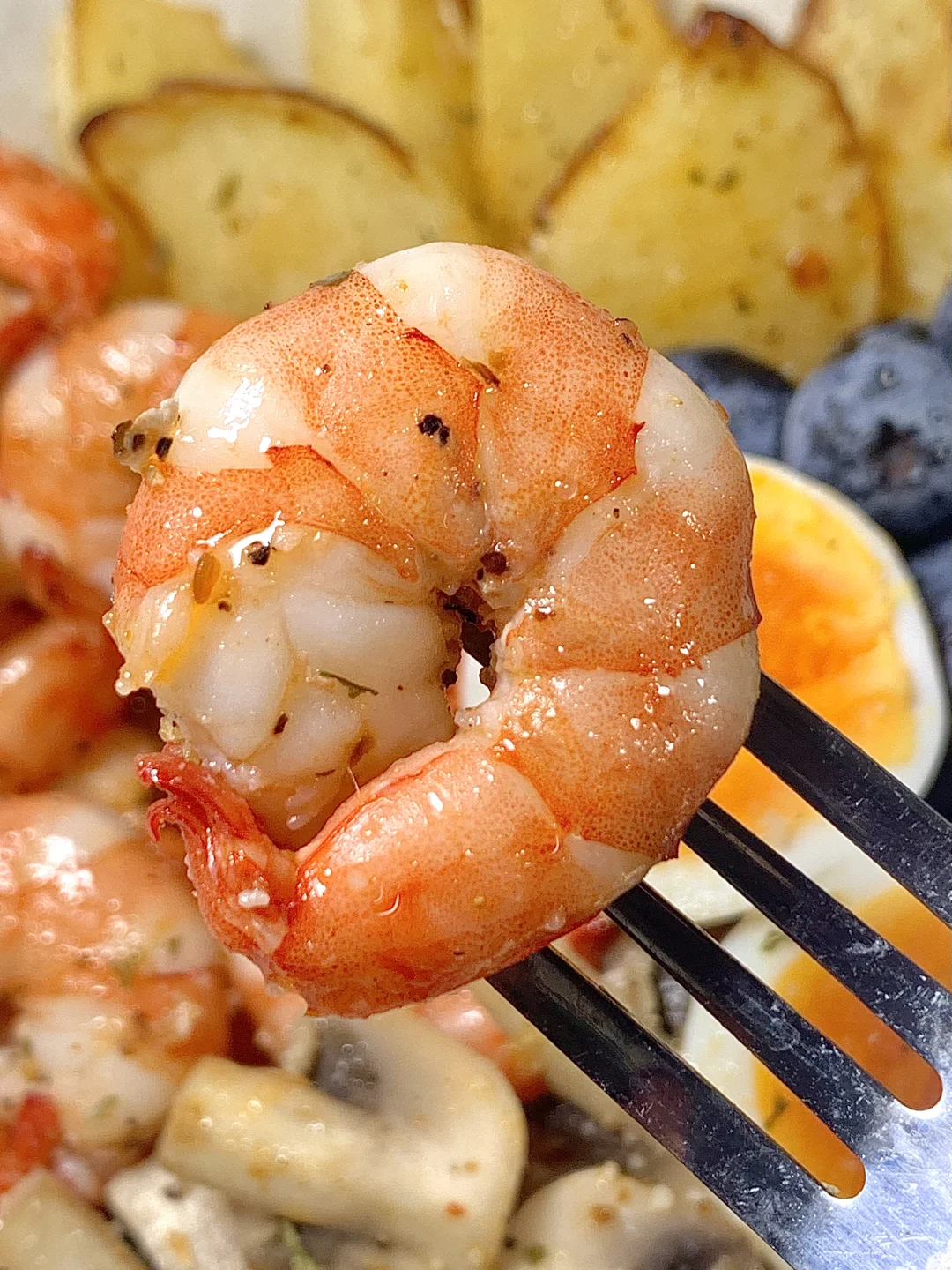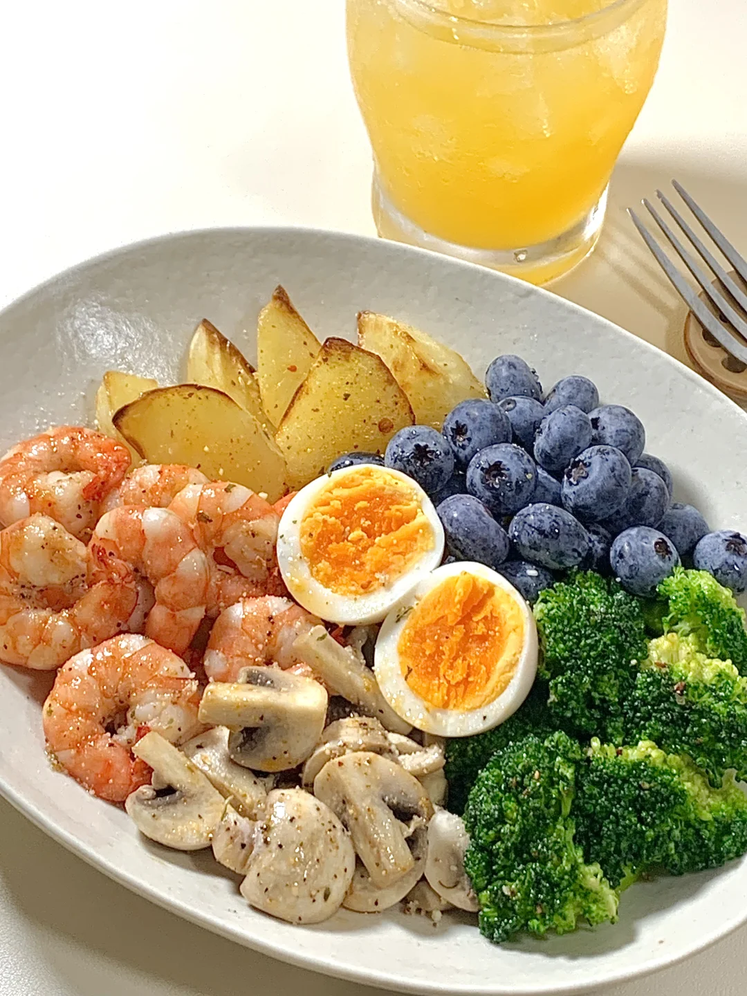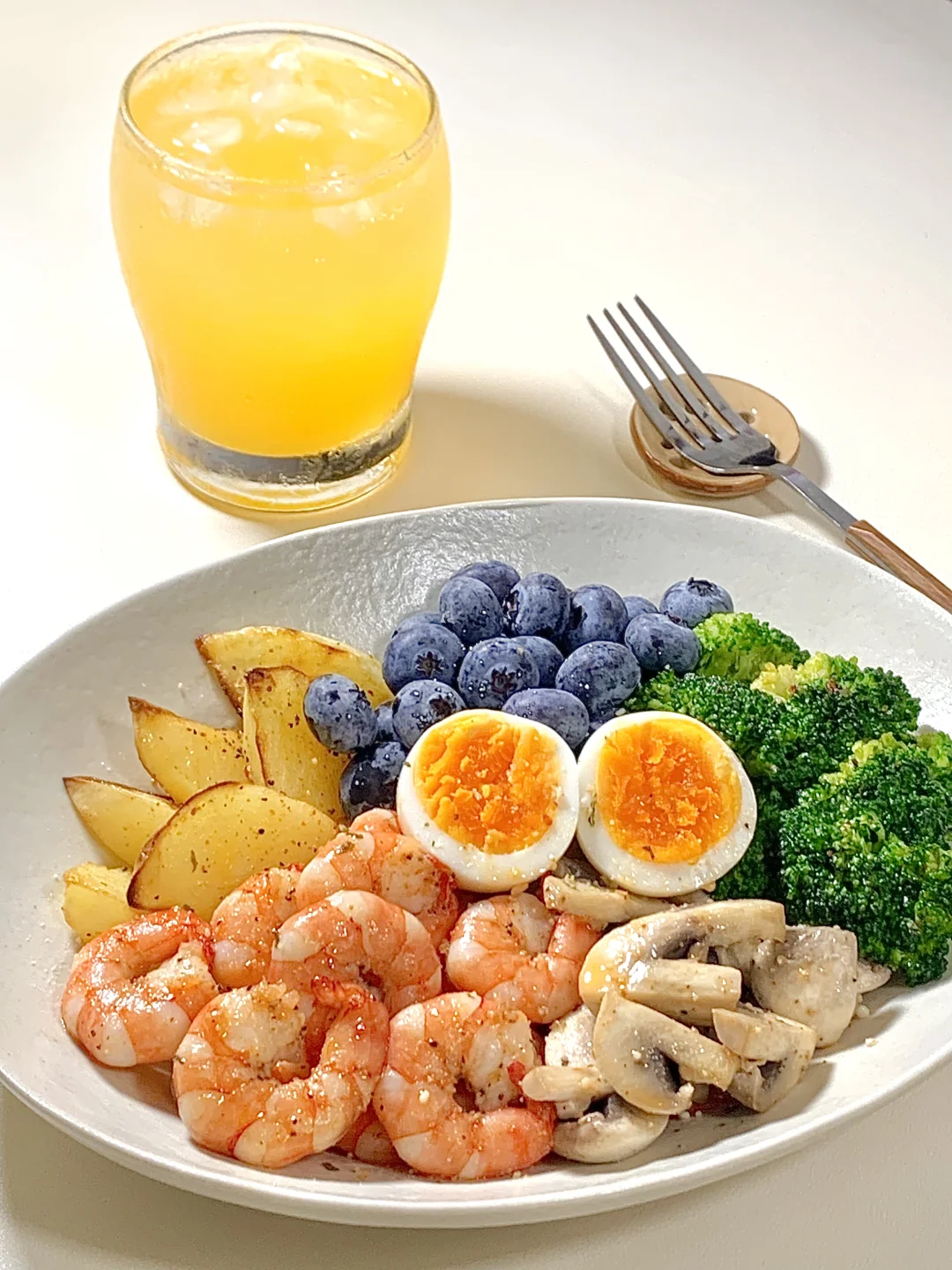 今日减脂餐虾仁溏心蛋拼盘!巨鲜美😋 📝食材:虾仁、鸡蛋、西兰花、土豆、口蘑、蓝莓 ✨做法: 1️⃣土豆滚刀切块 放入空气炸锅烤熟 2️⃣鸡蛋煮8分钟捞出过凉水 3️⃣锅里放适量水煮开 放西兰花焯水1分钟 4️⃣锅里喷油口蘑炒熟 5️⃣虾仁+黑胡椒盐腌制10分钟→起锅喷油倒入虾仁煎熟 🍃所有食材装入盘就可以开吃啦[色色R] 低卡低脂!姐妹们赶紧做起来[派对R]