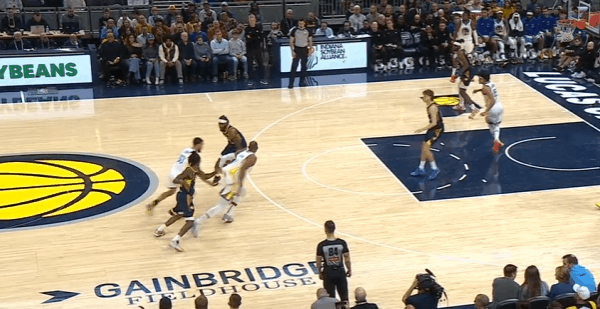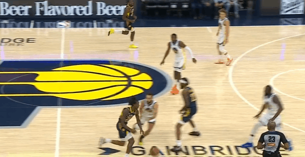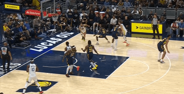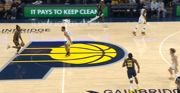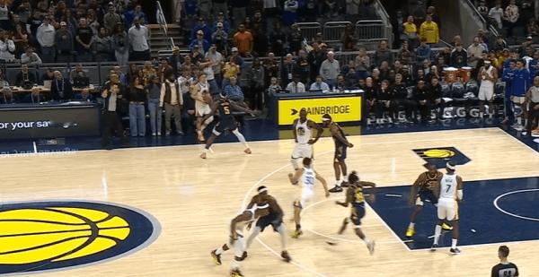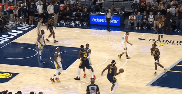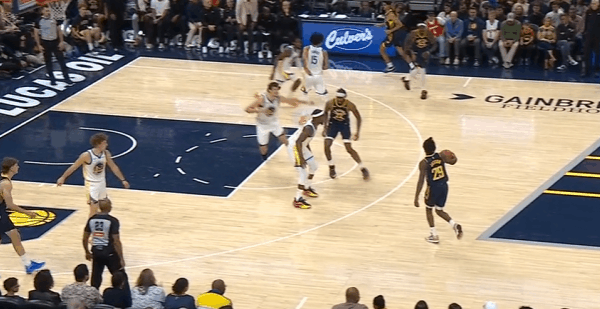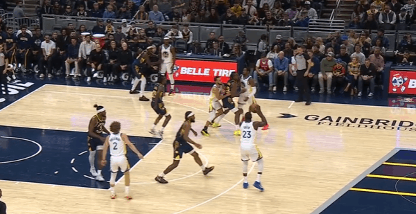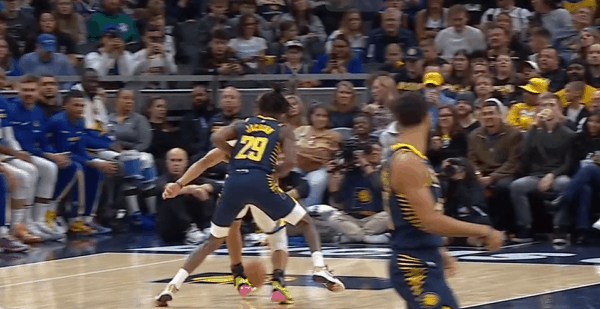 步行者vs勇士的第四节,杰克逊交球给西卡后摔倒,导致西卡被追梦、库名加在边线夹击,杰克逊起身后接应接球。