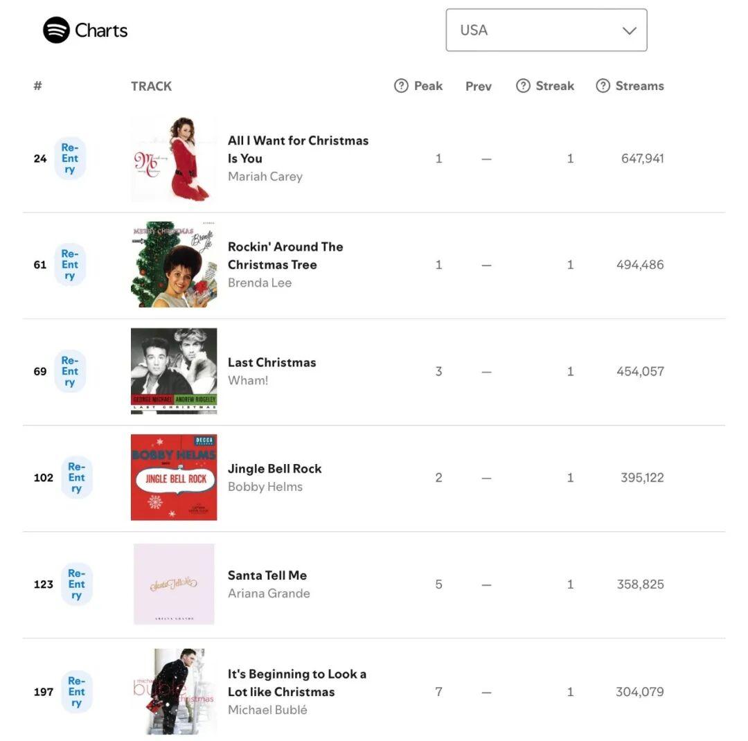 11月1日,玛丽亚·凯莉(Mariah Carey)的《All I Want For Christmas Is You》(《圣诞节我想要的只有你》)以182万次播放量重新进入全球Spotify排行榜,位列第58名。 威猛乐队(Wham!)的《Last Christmas》(《去年圣诞节》)以133.3万次播放量重返全球Spotify排行榜,位列第143名。 这一年怎么过得那么快啊。 今年必听歌曲其实是华裔歌手Goo的原创新曲《All I Want for Christmas Is Sugar on My Tongue》(《圣诞节我想要的只有舌尖的糖霜》)。