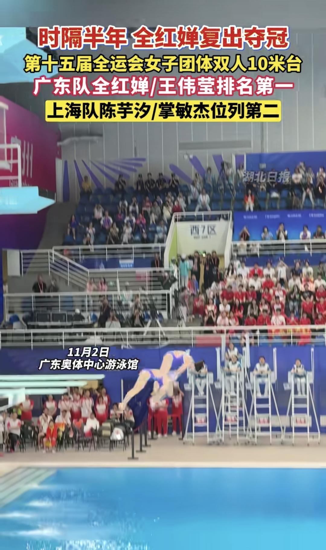 全红婵复出首秀夺金 看她这状态是真好,笑眯眯的,力量感十足,动作更优美了,水花只比一起多一丢丢,一点都不影响我对她的喜欢 就说时隔半年复出,王者归来还是王者,必须第一,这次双人十米台,全红婵/王伟莹组合夺冠! 大家仔细看第二个动作,从起跳高度到最后入水,你就知道队友的弹跳高度和滞空能力跟全红婵差距很大,全红婵的第二跳蹬的好高,第一圈翻转在台上都完成了,有些就着队友的感觉,但毕竟是双人赛,临时组队,能夺冠很棒了! 只是婵宝没有参加单人赛,还是有些可惜了,好在来日方长,你们说对吧?