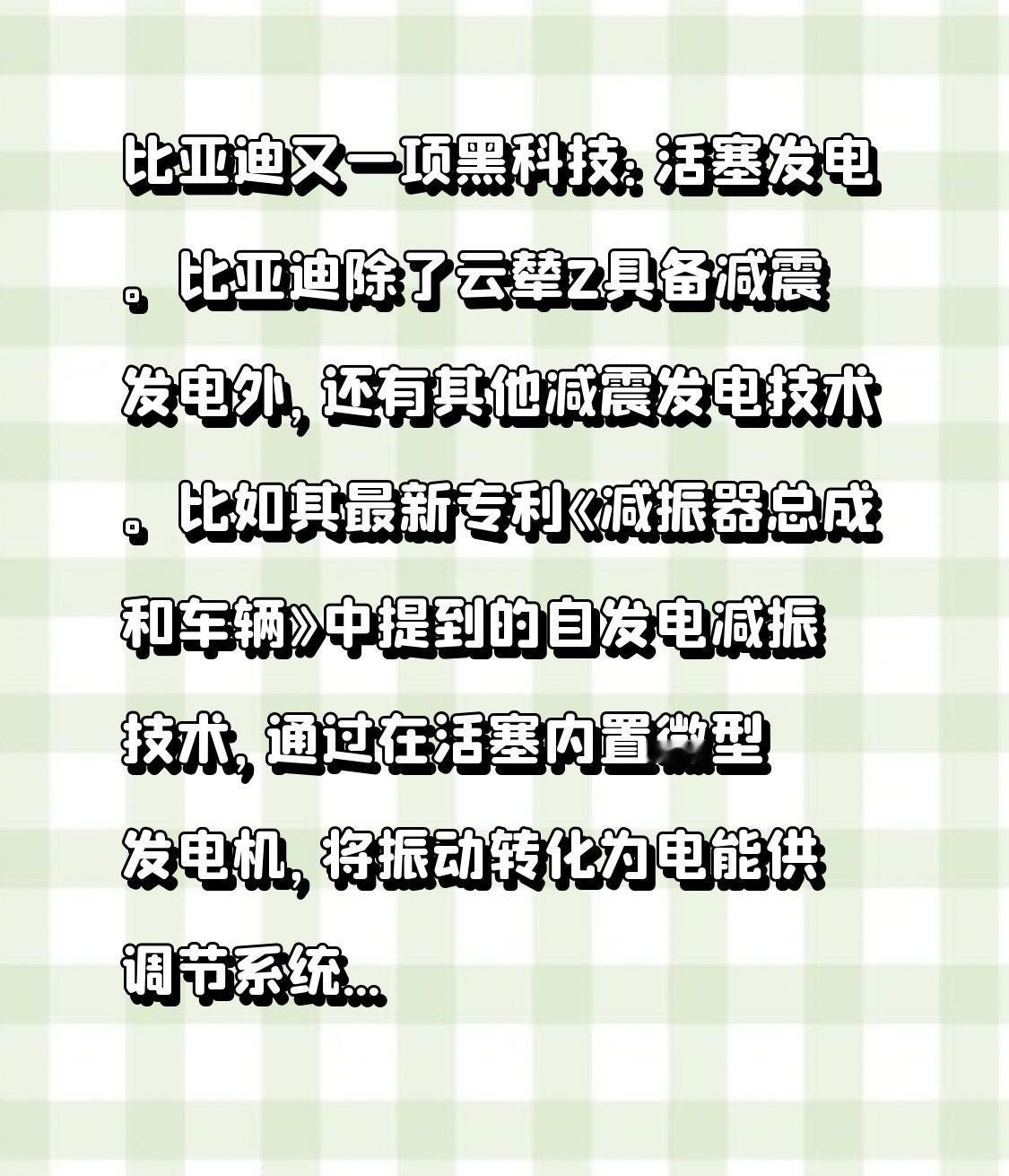 比亚迪又一项黑科技:活塞发电。 比亚迪除了云辇Z具备减震发电外,还有其他减震发电技术。 比如其最新专利《减振器总成和车辆》中提到的自发电减振技术,通过在活塞内置微型发电机,将振动转化为电能供调节系统使用,能耗比传统CDC降低90%。 另外,比亚迪公开号为CN117028407A的专利《电动减振装置及车辆》也提到,活塞内置微型发电机,可将振动机械能转化为电能,既为电场供电,又额外消耗30%振动能量。