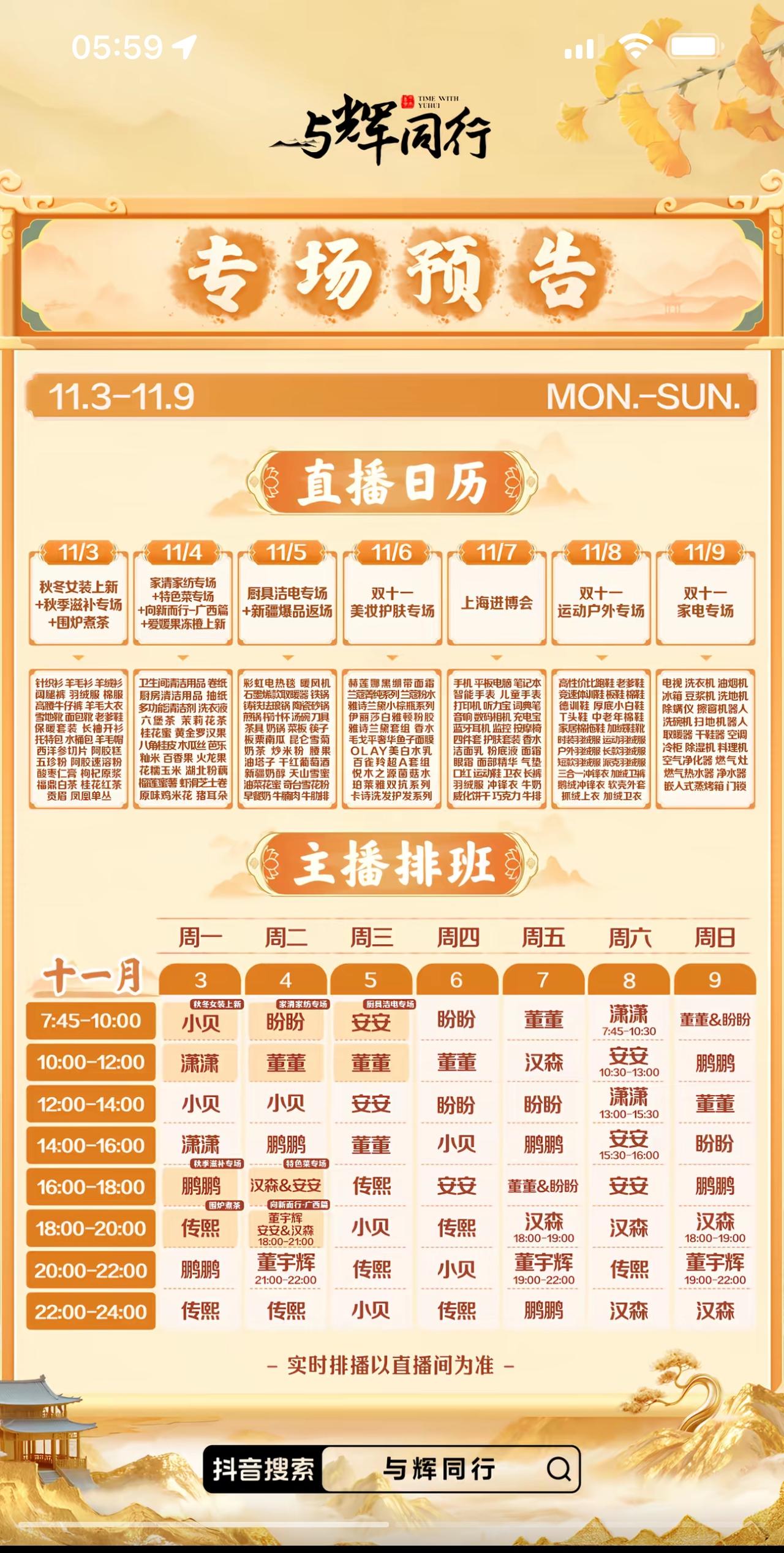 新的一周开始了, 一如既往的凌晨醒来就先看排班表, 再看昨天的业绩。[大笑][大笑] 不错不错, 这个星期有三个董宇辉, 并且三天就有两天是在外面, 4号是广西“向新而行”小专场, 这个专场来的有些突然, 但是仔细想想, 好像宇辉提前汇报过, 只是我没留意。 “突如其来”也没关系, 反正又是水果自由的一天。 11月7号跟着宇辉逛上海进博会。 宇辉这小子这个星期虽然只上播三天, 但是两个都是在外地, 不管是宇辉, 还是那一车设备, 都是舟车劳顿的一个星期。 这个星期兰知春序周末也排满了, 不知道以后都这样了, 还是因为双十一暂时改变的。 两天没看直播, 与辉同行昨天卖啥了? 怎么业绩又这样好? 卖了9250万, 还涨粉3.5万。 这十一月份才开始两天, 业绩就已经快1.6亿了, 呵呵呵, 这是两天业绩人家快赶上全家桶十天的销量了。 又是开心愉悦的一天。 散会! 董宇辉