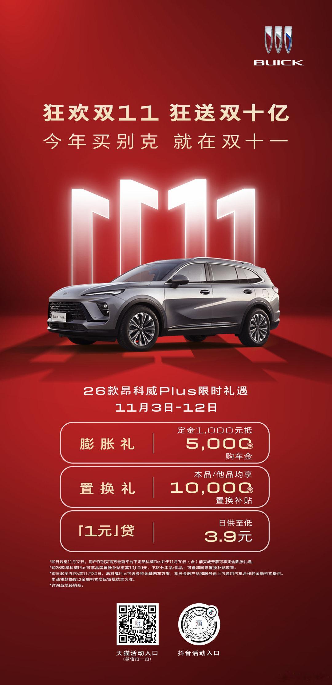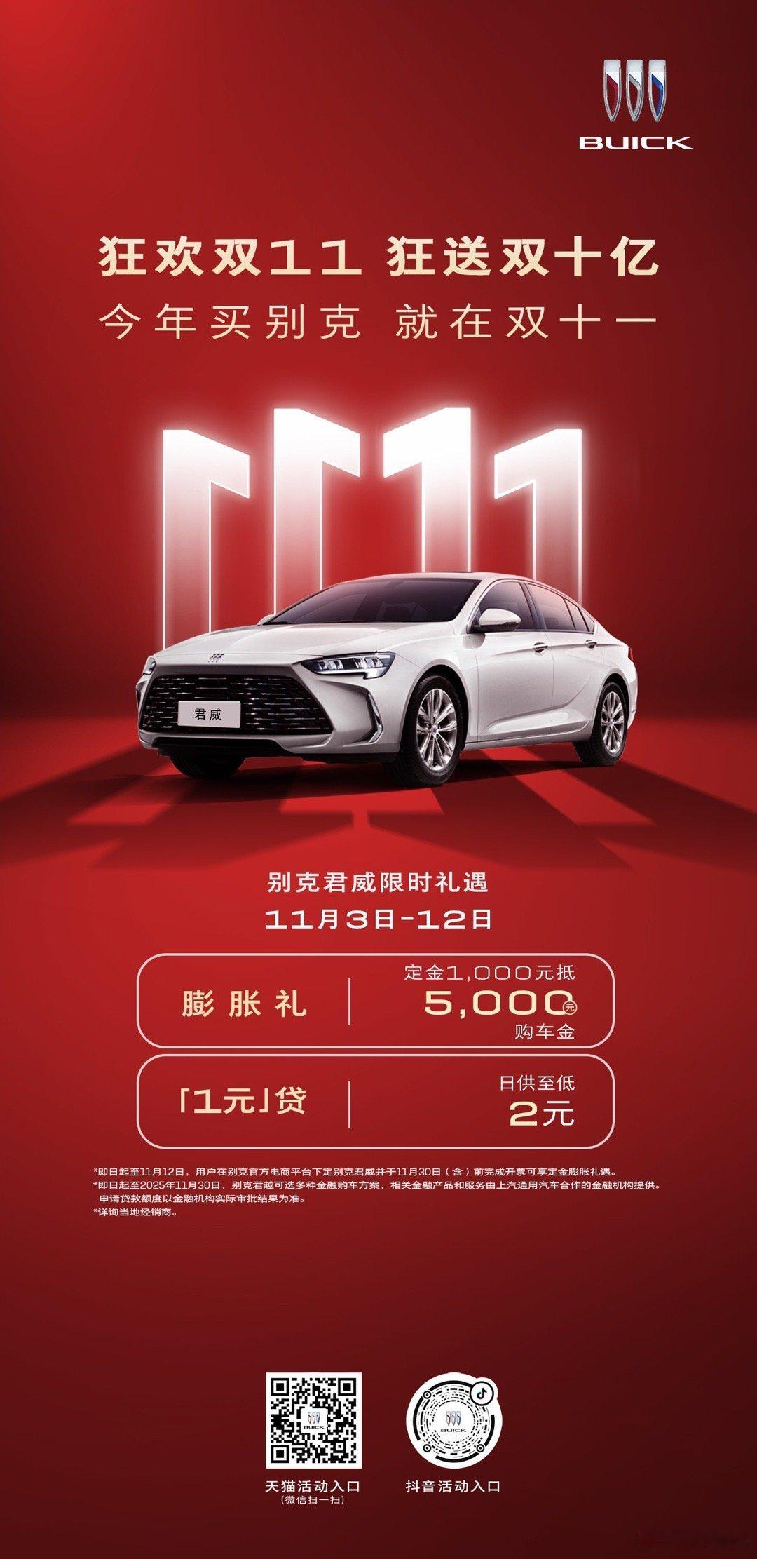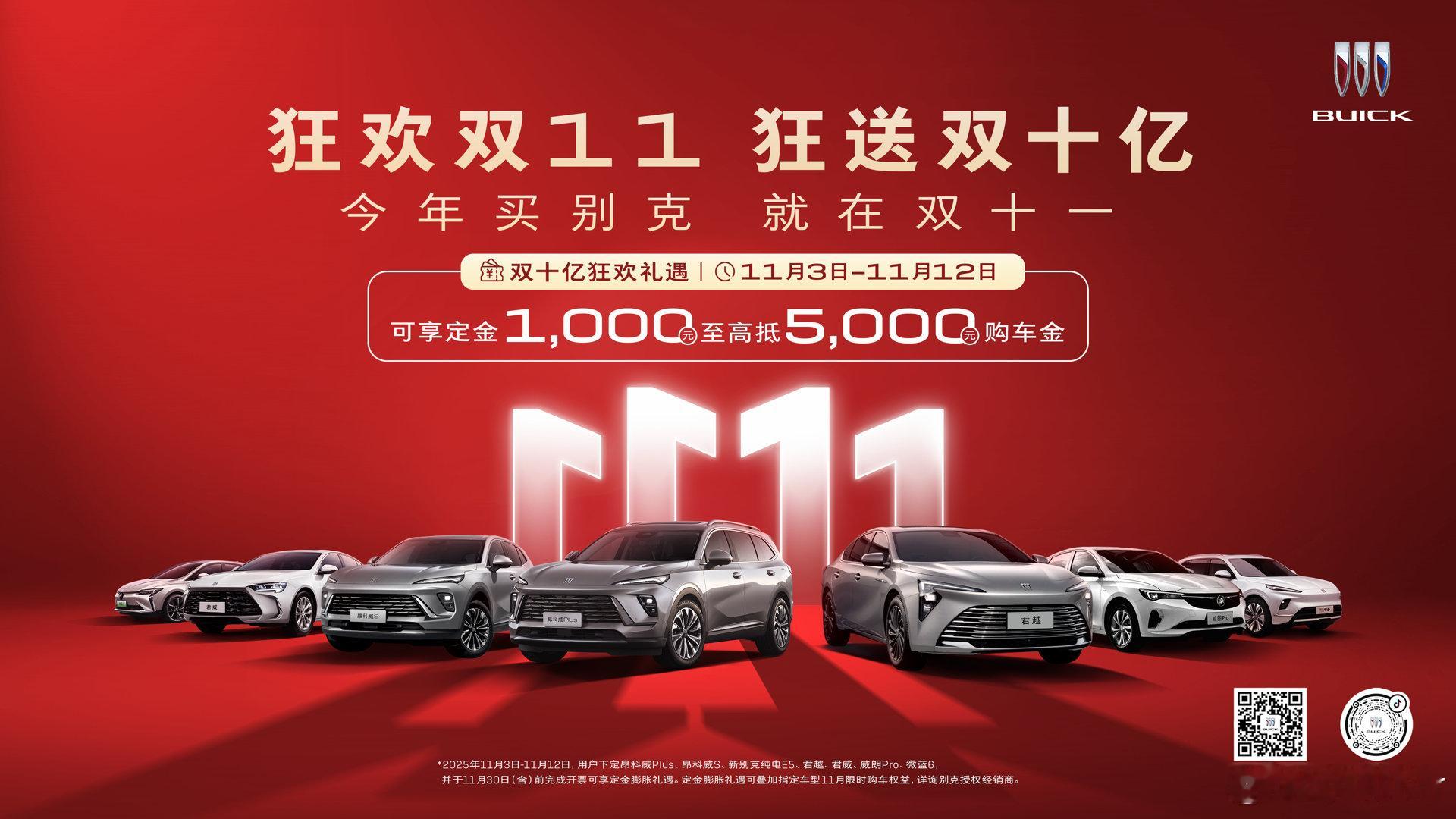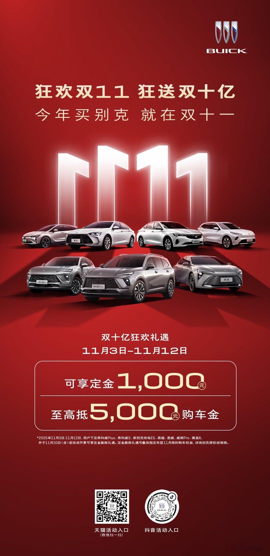 别克“狂欢双11,狂送双十亿”限时大促开启!2025年11月3日至11月12日(含)期间,用户购买昂科威Plus、昂科威S、25款君越、君威等车型可享定金1000元抵5000元,其中昂科威Plus和君越更可享受本品/他品置换10000元品牌补贴,并叠加享受至高15000元国补;购买别克纯电E5先享版,可享 “15 倍超级膨胀金” 限时福利,助力消费者轻松入手品质座驾。别克狂送双十亿