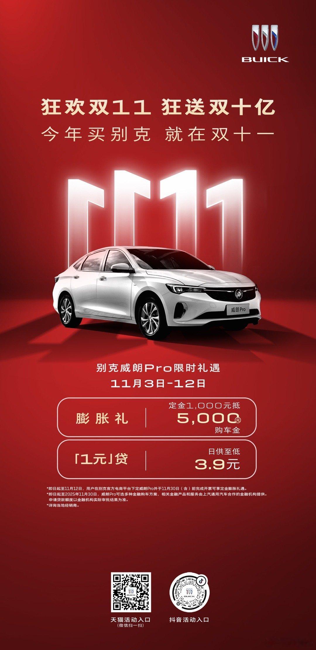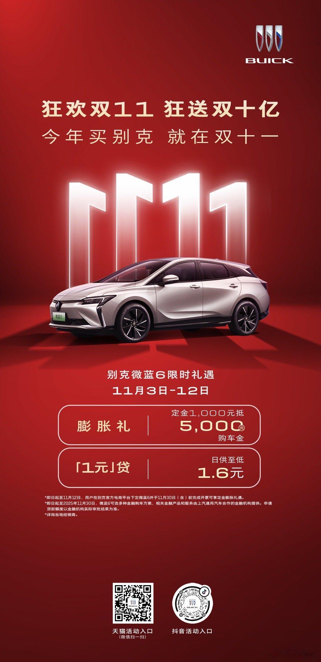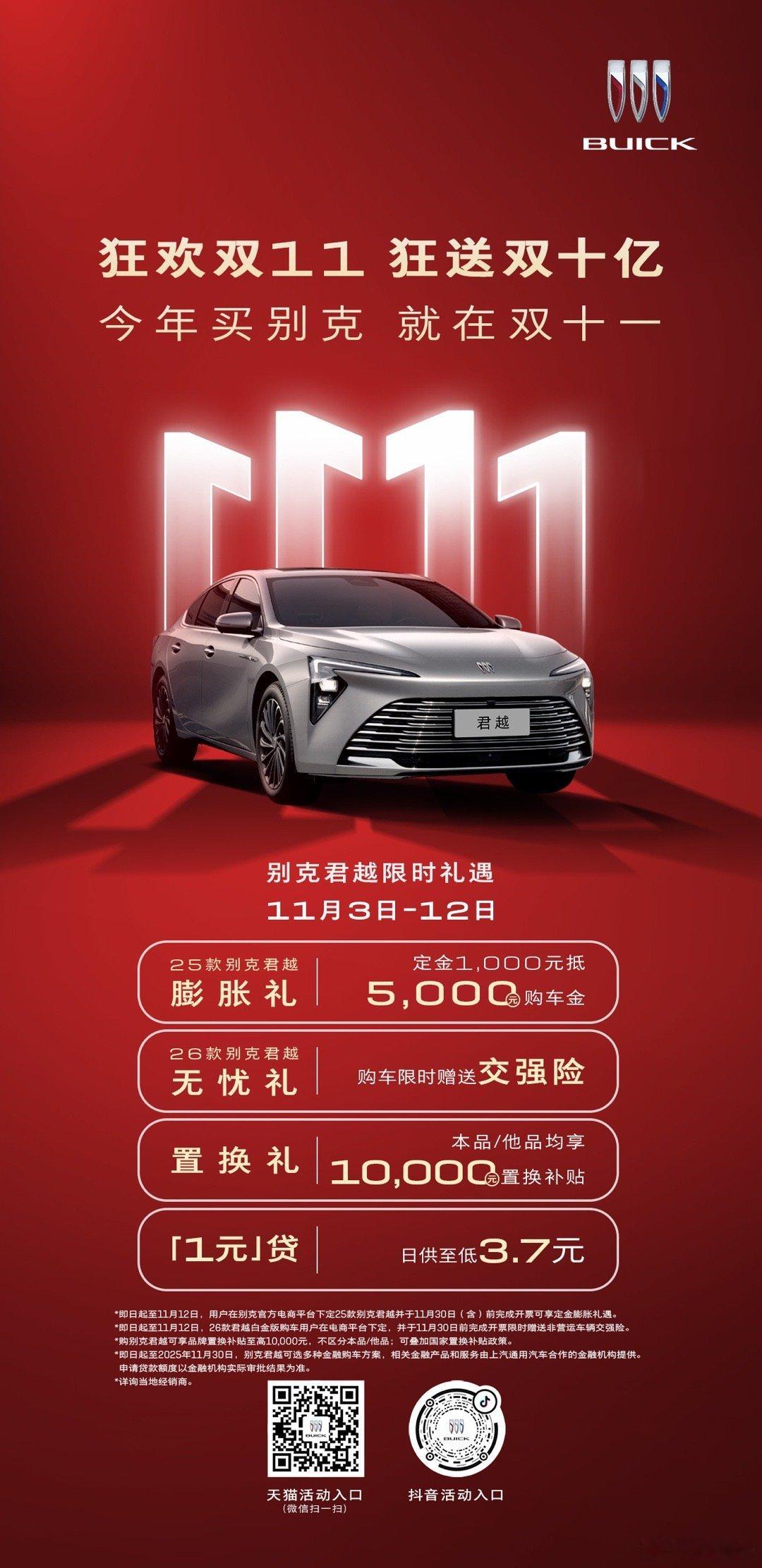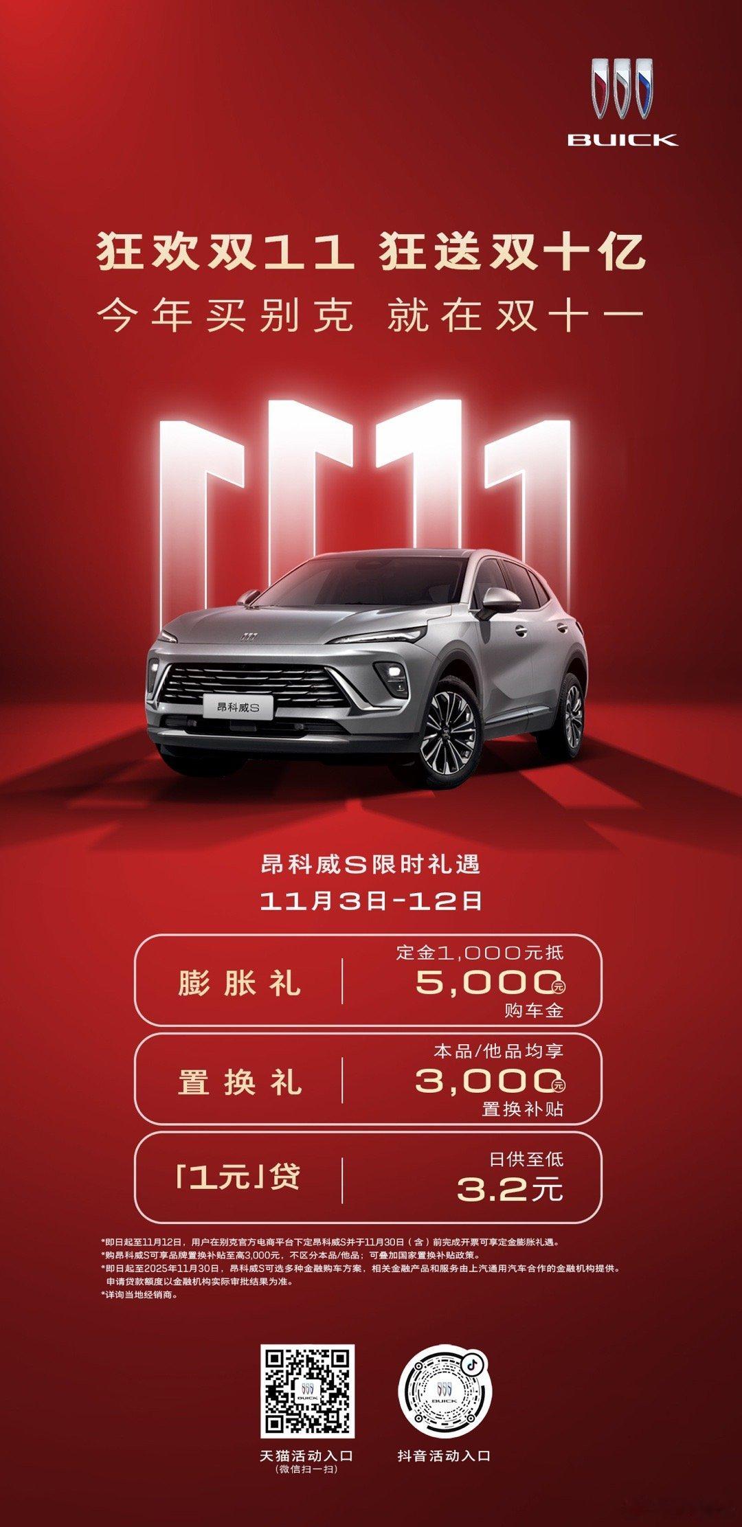 别克“狂欢双11,狂送双十亿”限时大促开启!2025年11月3日至11月12日(含)期间,用户购买昂科威Plus、昂科威S、25款君越、君威等车型可享定金1000元抵5000元,其中昂科威Plus和君越更可享受本品/他品置换10000元品牌补贴,并叠加享受至高15000元国补;购买别克纯电E5先享版,可享 “15 倍超级膨胀金” 限时福利,助力消费者轻松入手品质座驾。别克狂送双十亿