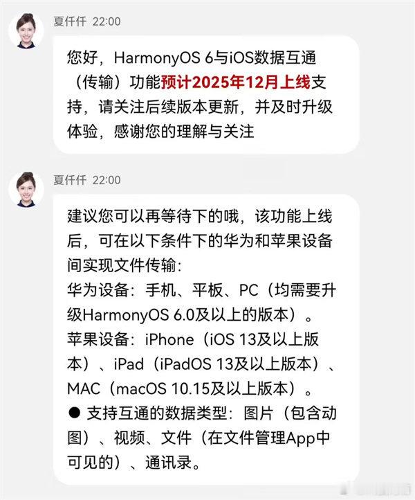上线后,华为设备(手机、平板、PC需升级至HarmonyOS 6.0及以上)与苹果设备(iPhone需iOS 13及以上、iPad需iPadOS 13及以上、Mac需macOS 10.15及以上)间,可传输图片(含动图)、视频、文件管理App内可见文件及通讯录。