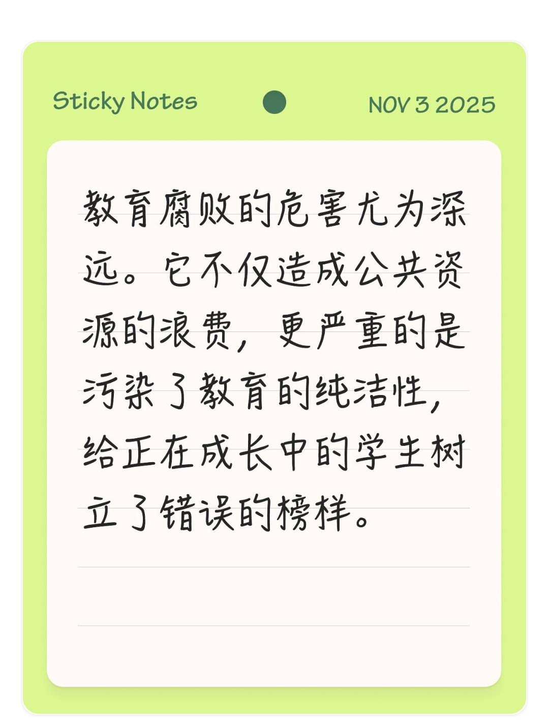 不同于其他领域的腐败,教育系统的腐败行为往往披着"为学生好"的外衣,更具有隐蔽性。个别管理者却在后勤采购、基建工程、招生入学等环节中谋取私利。 这种腐败的危害尤为深远。它不仅造成公共资源的浪费,更严重的是污染了教育的纯洁性,给正在成长中的学生树立了错误的榜样。