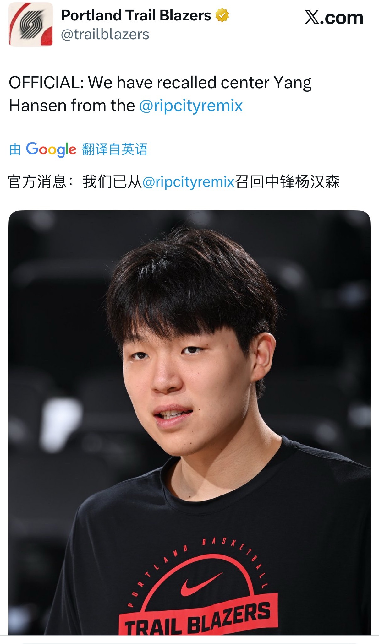 开拓者官宣从发展联盟召回杨瀚森