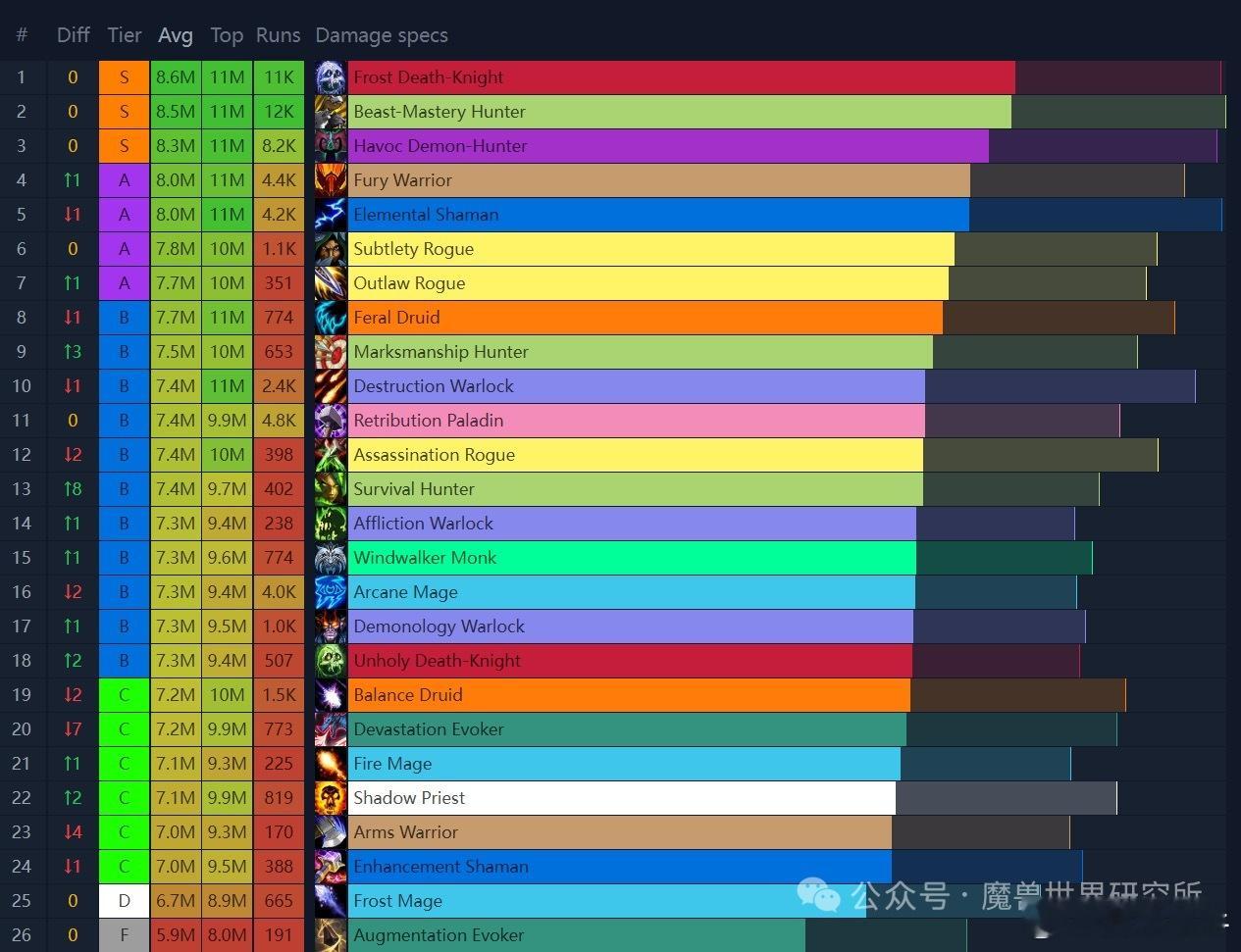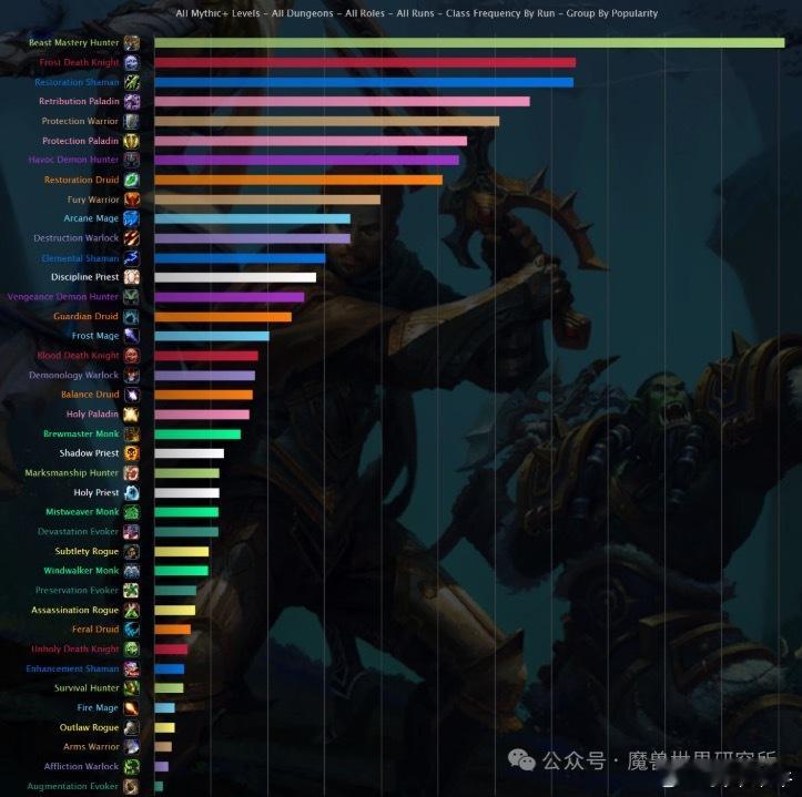 可以看到,冰DK和兽王猎的平均伤害条都遥遥领先,而在TOP伤害里,顶级兽王猎玩家的伤害甚至高于顶级冰DK!在人数方面,兽王猎更是钦点版本之子!