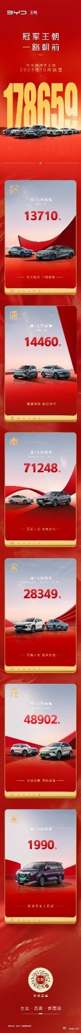 红色喜报,好喜庆!比亚迪王朝10月销售178659辆,以智造之力朝前奋进!