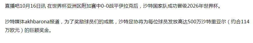 不知道国脚看到这条新闻,心理是啥滋味 据沙特媒体报道,沙特队打进2026年世界杯后,沙特足协为了奖励那些国脚,平均为每位国脚发了500万沙特里亚尔(约合114万欧元,约935万元人民币)的巨额奖励。 在目前的中超薪资水平下,这相当于两年的顶薪了。如果那些国脚努努力,是不是有可能呢?那么几场比赛,再苦再累,不就那么几天吗?名利双收的事,还玩砸了,只落个寂寞。 怪谁呢?