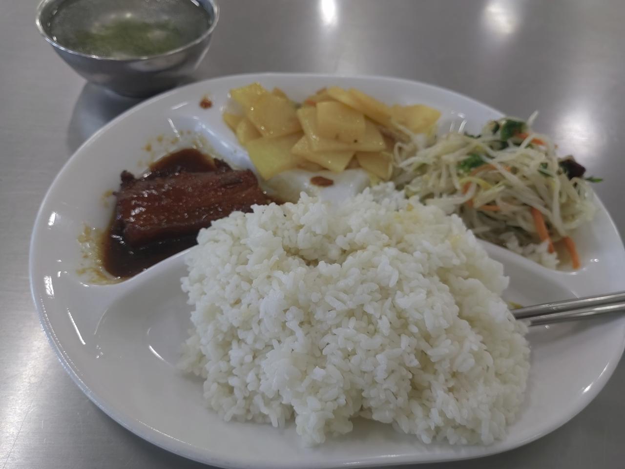 每天中午都回家,确实也挺累的,今天中午去餐厅吃了一顿,难得有红烧肉,这九块五吃的