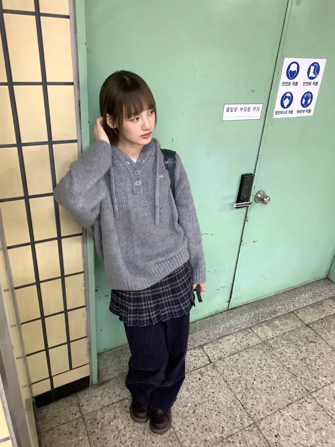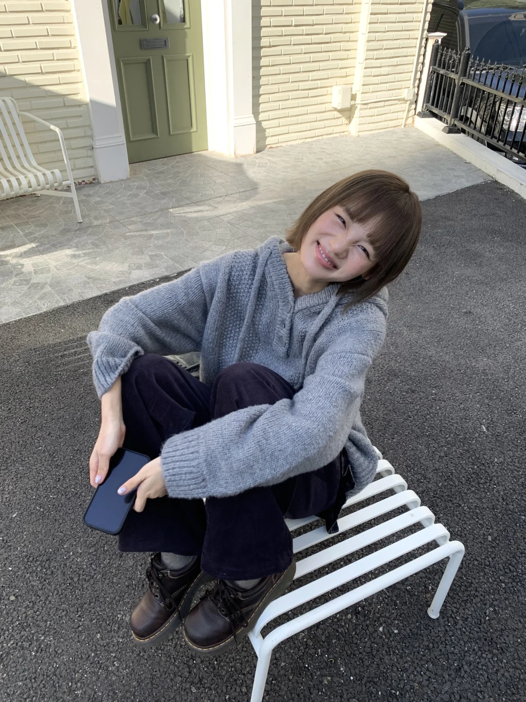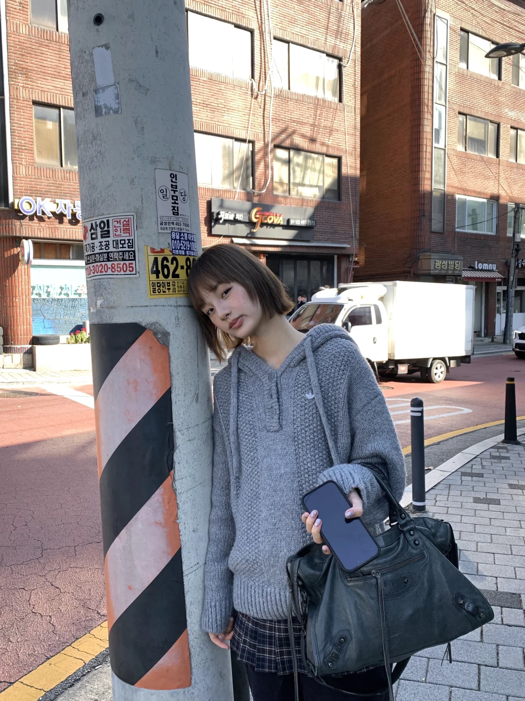 街头偶遇一位女士,米白交叉针织衫配浅蓝牛仔裤,脚踩米色高筒靴,简约又时尚,尽显都