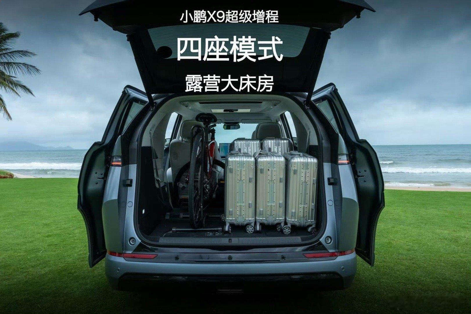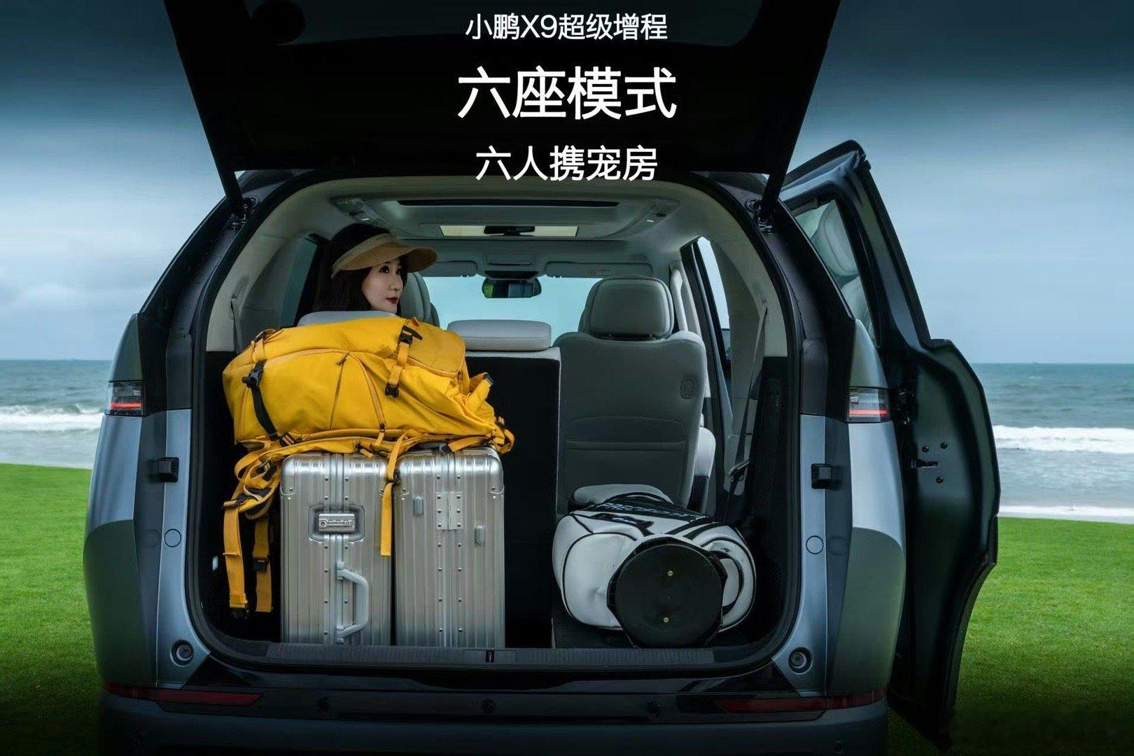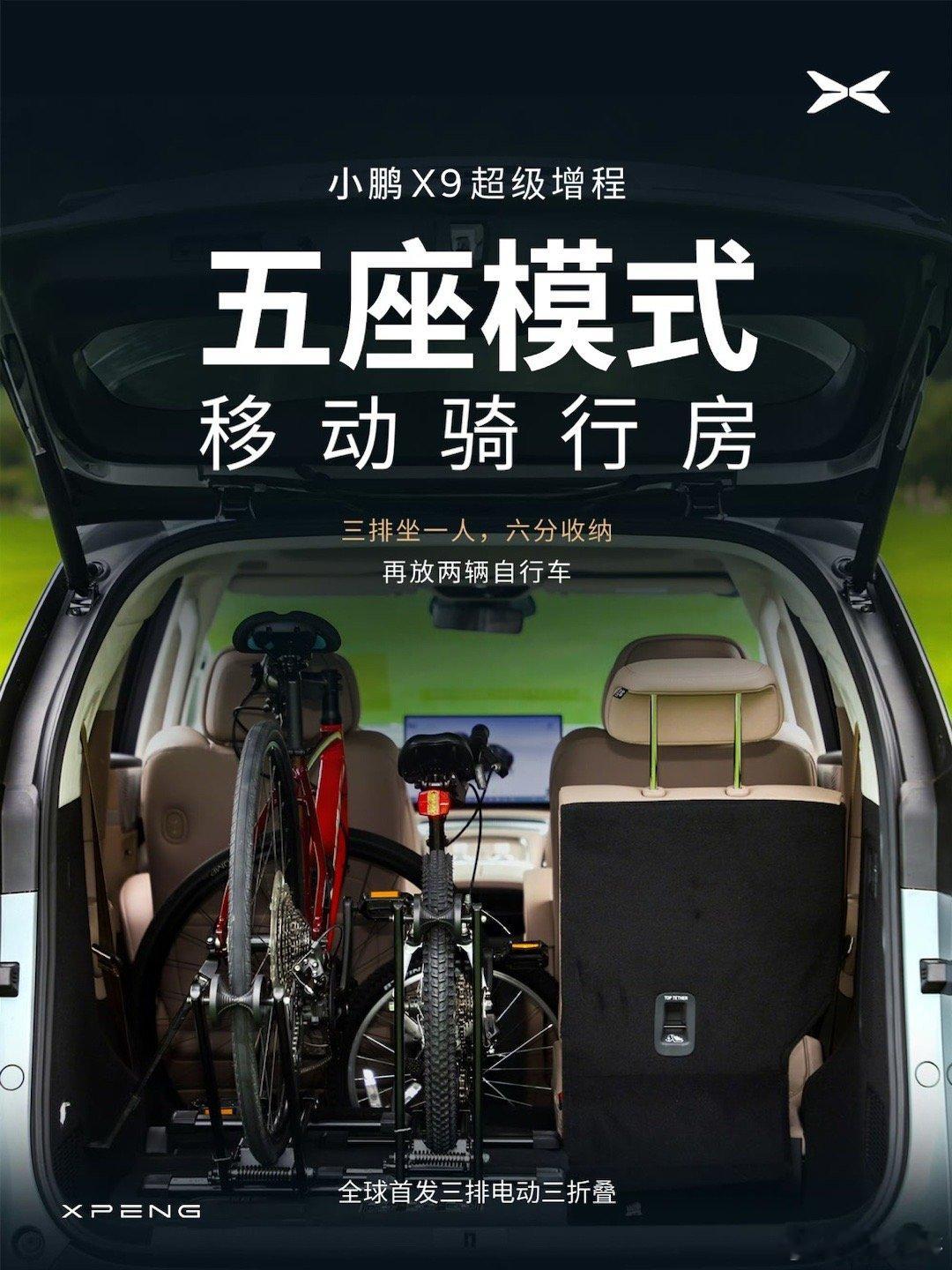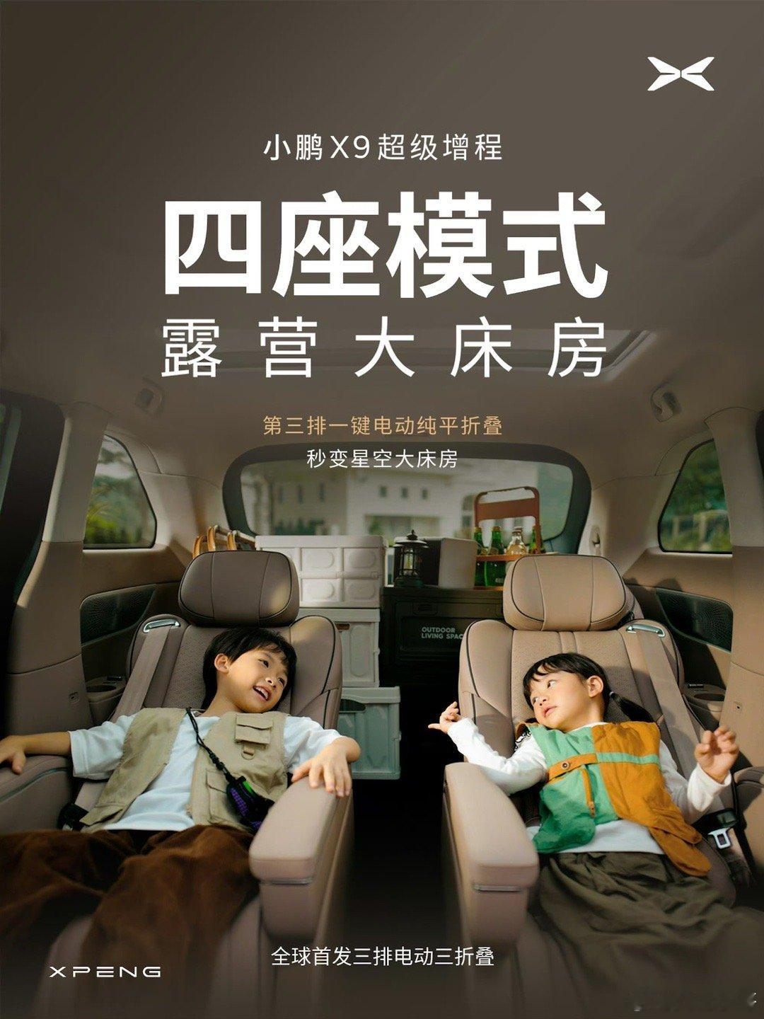 新款小鹏X9首发电动三折叠小鹏X9超级增程携全球首发三排电动三折叠而来,以空间魔术解锁全场景出行。一键切换四种模式,满足多元需求:四座秒变露营大床房,纯平空间共赏星空;五座化身移动骑行房,轻松收纳两辆自行车;六座升级携宠房,人与萌宠舒适同行;七座开启豪华大平层,满载七人仍能装下7个24寸行李箱。每一程,皆为高光时刻。