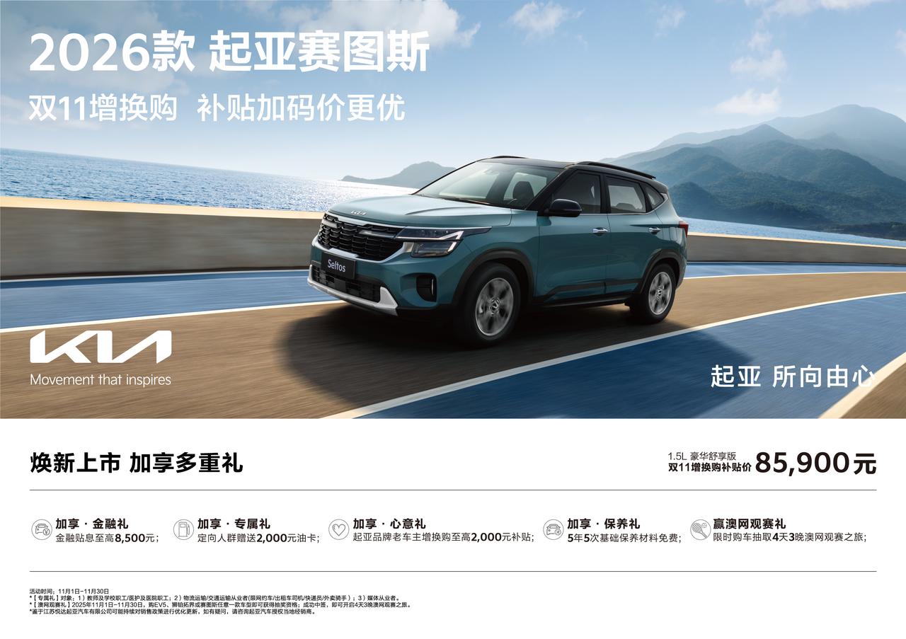 2026款赛图斯以全维实力,定义高价值SUV新基准 在竞争激烈的汽车市场,一款车要脱颖而出必须在设计的引领性、配置的实用性、动力的经济性和价格的诚意上,实现全维度的均衡。2026款起亚赛图斯是一款深刻洞察并精准回应了当下用户多元化需求的全球品质座驾。它在舒适性上的升级尤为突出,直击用户的核心痛点。2026款赛图斯 1.5L 豪华舒享版配备了同级罕见的前排座椅通风与加热功能,这一通常出现在更高级别车型上的配置,确保了用户无论酷暑严寒,都能享受到最宜人的乘坐体验。这份舒适感同样延伸至智能科技领域,同时增配了科技感十足的10.25英寸炫彩仪表盘、Kia Connect 3.0智能互联系统,以及BVM侧后方影像和SVM 360°全景影像等高阶安全配置,极大提升了日常用车的便捷性与安全性。 现在2026款赛图斯1.5L豪华舒享版限时促销价为89,900元,若叠加增换购补贴,综合补贴后仅需85,900元。起亚还提供了5年5次基础保养材料免费的超值权益,并有机会抽取4天3晚澳网观赛之旅,这无疑是为追求高品质、高价值的消费者,提供了一个极具说服力的选择。