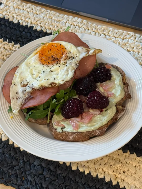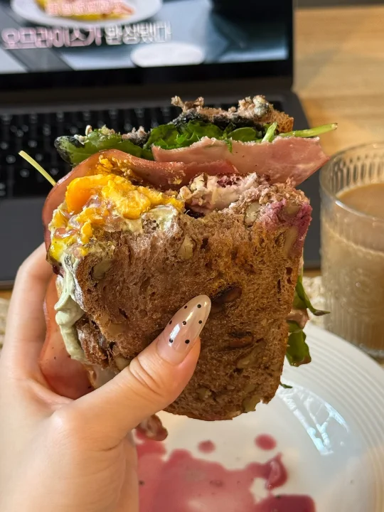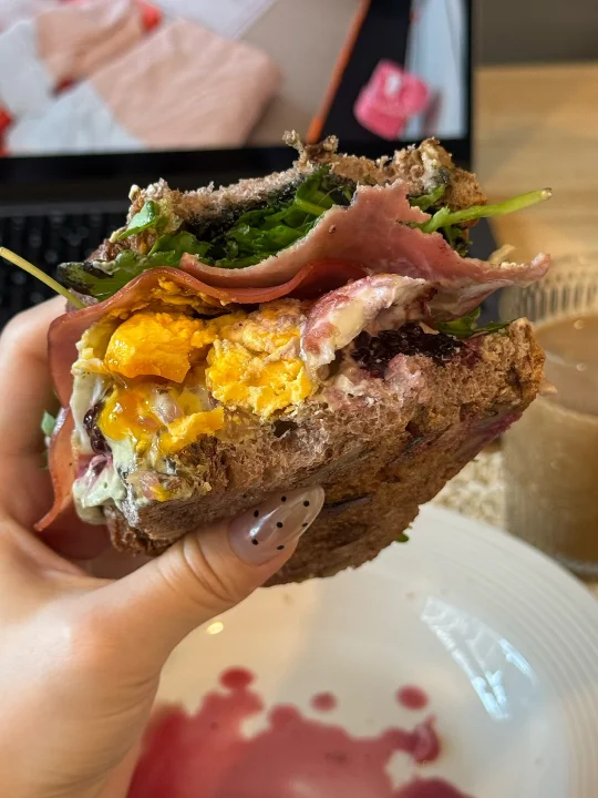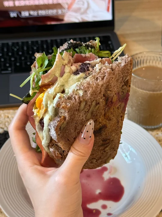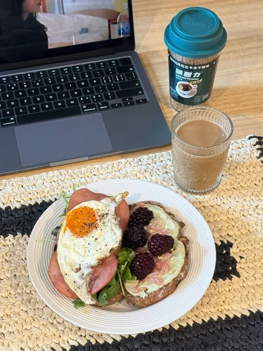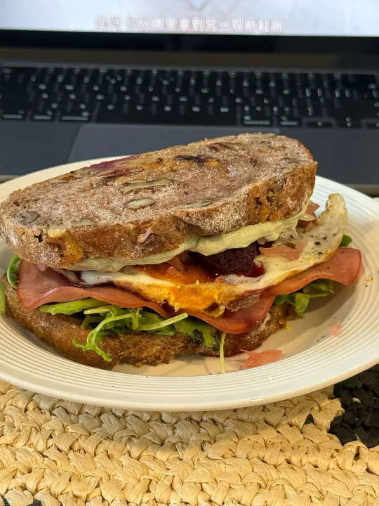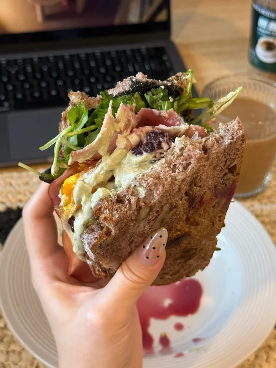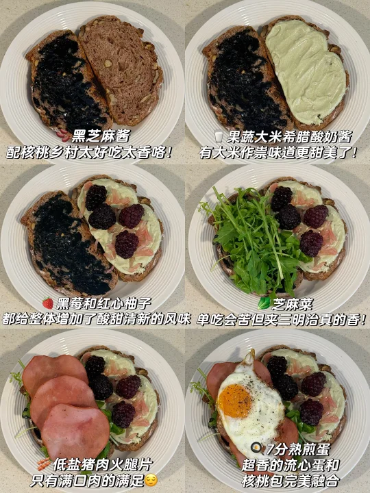 📍佛系养生D382 初始:56.6kg 今早:54kg 【早餐】 🍞核桃法式乡村是去上海时顺手带回的,没想到这么香! 🫘黑芝麻酱配核桃乡村太好吃太香咯! 🥛果蔬大米希腊酸奶酱,有大米作祟味道更甜美了! 🍓黑莓和红心柚子都给整体增加了酸甜清新的风味 🥬芝麻菜单吃会苦但夹三明治真的香! 🥓低盐猪肉火腿片只有满口肉的满足😌 🍳7分熟煎蛋,超香的流心蛋和核桃包完美融合[哇R] ☕️燕麦拿铁:冻干黑咖啡➕燕麦奶