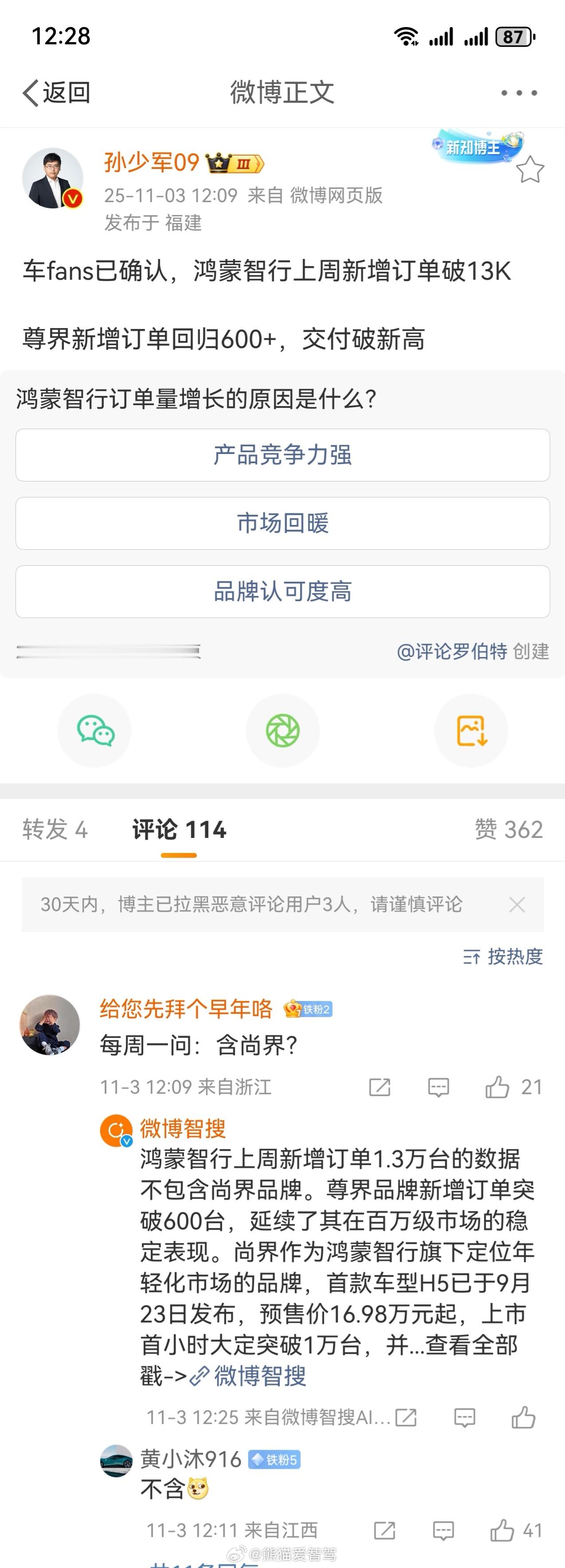 车fans透露,上周(10月27日-11月2日)鸿蒙智行订单继续保持13K的稳定增长!