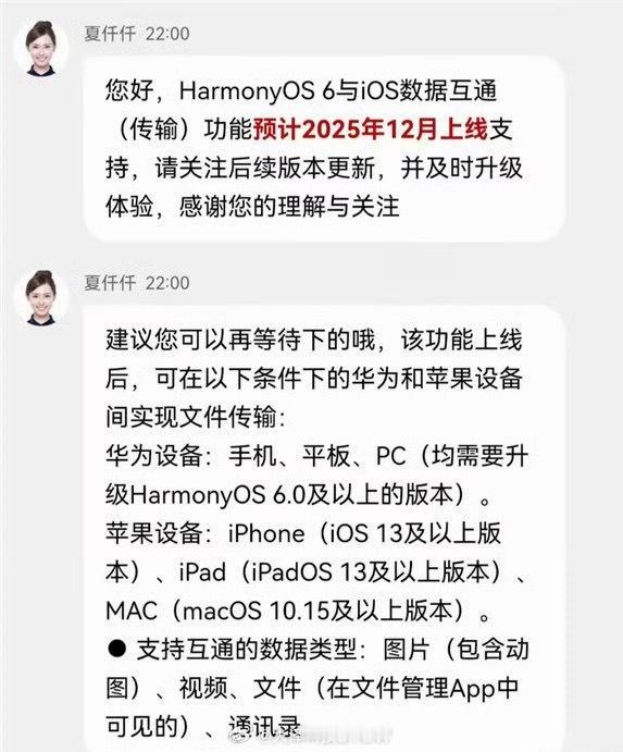 华为与苹果互传功能预计12月上线真香啊,这是鸿蒙系统的一大步,想想以后华为和苹果也可以互联互通了,比如我用iPhone拍完视频无缝流转华为折叠屏电脑上,或者用华为手机拍完照片传到Mac上,画面真美[doge]