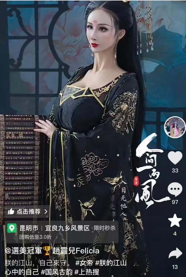 无惧流言蜚语,“灵儿”社媒最新动态:朕的江山,自己来守!这位直击我们灵魂的选美冠军,是个云南妹子?人家才不理你们,活出自我! 这几天,赵灵儿忽然大火了一把,源自于“选美界”的一股歪风邪气被网友们整顿。 不过刚才看了她的社交媒体,11月1、2日凌晨依旧更新,发布了最新的“美照”…… 一张是“女王”范儿十足的古风照,配文:“朕的江山,自己来守”,另一段是个视频,别说拍的还是挺好的,很有金庸剧“梅超风”的那股子劲儿! 看她的IP,多数显示云南,看来是个云南妹子?那就是我们川渝云贵“折耳根联盟”的人了? 其实挺佩服她的,人家不偷不抢,也不在乎外界的流言蜚语,永远沉浸在自己的美貌中,有什么问题? 至于你们非要大晚上的点开人家的照片,自己吓自己,明明就是你们的不对了嘛,不能怪别人哦。 能感觉的到,她是很希望要流量的,毕竟走的就是这样一条路。 如今忽然就火了,虽然并非什么正路子,但是“邪火”也是火啊,没啥害羞的,灵儿你赶紧接住这拨泼天的“流量”哈…… 网友们天天在选美圈里闹腾,扒这个扒那个,其实最应该嘲讽的是那些莫名其妙的评委,关人家妹子们什么事儿? 评委的评判标准决定的冠军的归属,他们的眼神有问题,才应该被口诛笔伐,别让妹子们背锅哦! 爱美之心人皆有之,自己爱上自己的美貌……没啥错嘛!是不?