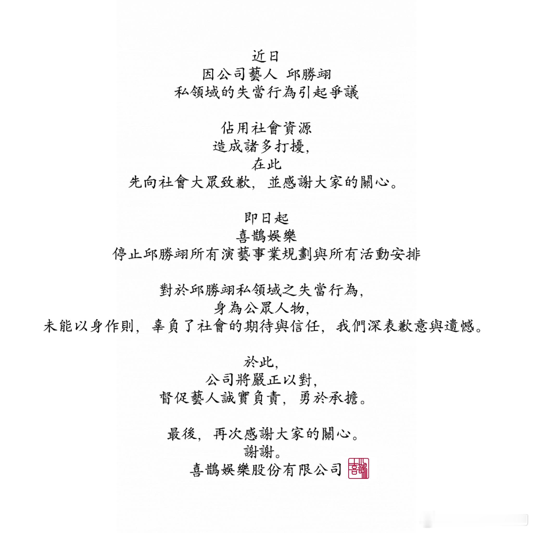 王子邱胜翊因为介入别人家庭,“超过了朋友间应有的界线”,被经纪公司全面停工了。