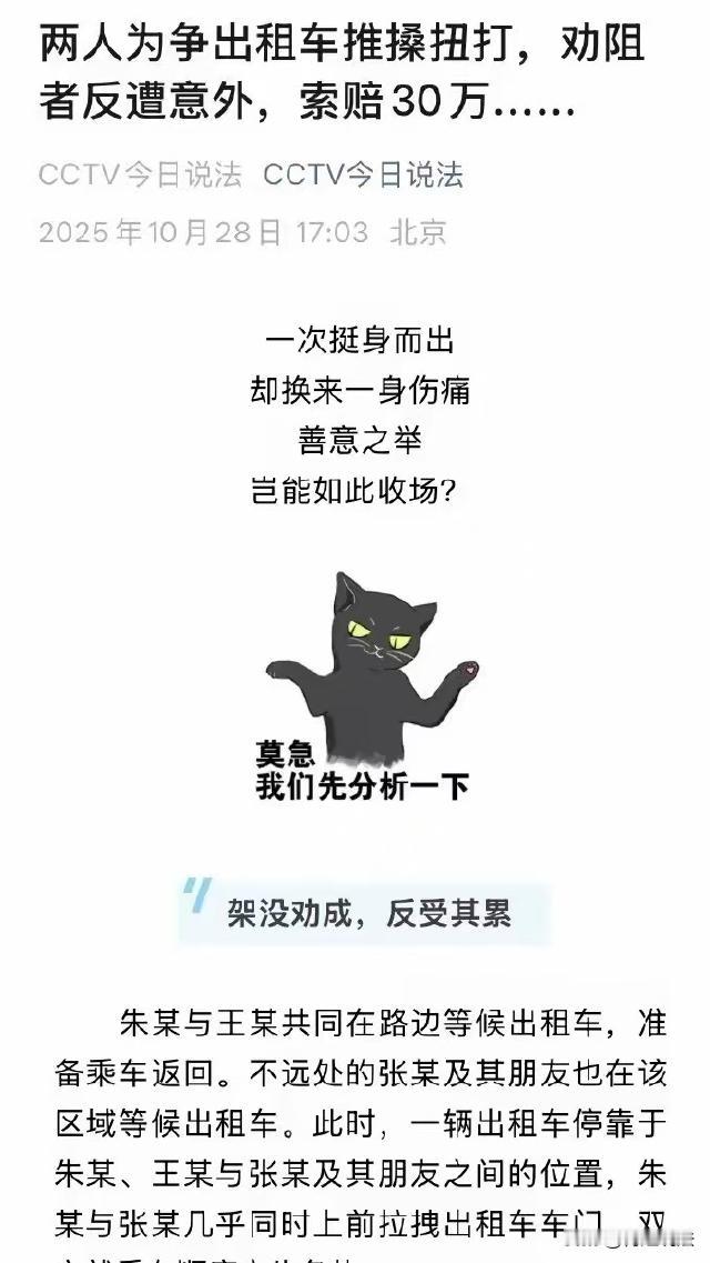好心劝架咋就落得如此下场?朱某和张某争出租车起争执扭打,王某作为朱某朋友上前劝阻,结果在推搡中被路沿石绊倒受伤,医疗费就花了8万多,于是起诉向张某索赔30余万。 事发当天,朱某和张某站在路边等出租车,车刚停稳,俩人同时伸手去拉车门。为谁先上车这点小事,两人从拌嘴到推搡,最后直接扭打成一团。 王某是朱某的朋友,当时和朱某站在一起等车,看到俩人打得不可开交,王某第一反应就是赶紧拉开他们。可现场乱成一锅粥,三个人挤在一块,你推我搡的。 王某本来想从中间隔开两人,可张某情绪激动,胳膊肘一甩,正好撞在王某胸口。 王某踉跄着往后退,脚底下没站稳,被路沿石绊了个正着,整个人重重摔在人行道上,右腿膝盖传来剧痛。 当时王某疼得直冒冷汗,想站起来却使不上劲,朱某和张某这才停手,围过来查看情况。 王某的右腿已经肿得老高,根本没法走路,朱某赶紧打了120,把王某送到医院。 经检查,王某右胫骨平台骨折,需要马上住院治疗。这一住就是二十多天,光医疗费就花了八万多。王某躺在病床上越想越气,自己好心劝架,结果落得这个下场。 出院后王某越想越觉得委屈,他觉得这事儿得有人负责。张某和朱某打架才导致自己受伤,这笔医疗费不能全由自己承担,于是决定起诉张某索赔。 王某要求张某赔偿医疗费、误工费、护理费等各项损失,总共三十多万。法院受理案件后,发现遗漏了主体,又追加朱某作为共同被告。 王某认为,朱某和张某在公共场所打架,导致自己受伤,两人都有过错。张某则辩称,王某受伤是意外,自己不应承担主要责任。 朱某说,自己和王某是朋友,当时看到王某受伤也很着急。但他认为,王某作为成年人,在劝架时没有注意自身安全,也应该承担部分责任。 本案从法律角度应该如何分析?朱某和张某在公共场所打架,是否构成违反治安管理行为?王某作为劝架者受伤,朱某和张某是否应承担全部赔偿责任?若王某因伤导致残疾,朱某和张某是否应承担残疾赔偿金等后续费用? 首先,《治安管理处罚法》第二十三条规定,扰乱车站、港口等公共场所秩序的,可处警告或者二百元以下罚款;情节较重的,处五日以上十日以下拘留。 朱某和张某在街头为乘车顺序争执扭打,破坏了公共场所秩序,构成违反治安管理行为,应受行政处罚。 其次,《民法典》第一千一百六十五条,行为人因过错侵害他人民事权益造成损害的,应当承担侵权责任。 王某劝架受伤,朱某和张某打架行为与王某受伤有因果关系,两人都有过错,应承担赔偿责任。 不过,王某作为完全民事行为能力人,劝架时没充分注意自身安全,自己也有一定责任。 要是王某因伤残疾,朱某和张某还得承担残疾赔偿金等后续费用。 《民法典》第一千一百七十九条规定,侵害他人造成人身损害的,应当赔偿医疗费、护理费等合理费用,造成残疾的,还应当赔偿辅助器具费和残疾赔偿金。 经审理认为,朱某和张某因乘车顺序发生争执并扭打,王某作为朱某朋友上前劝阻。在推搡过程中,王某被路沿石绊倒受伤,朱某和张某的行为与王某受伤存在因果关系。 最终,一审酌定朱某和张某各承担40%的责任,分别赔偿王某六万多元。王某自己承担20%的责任。 张某对这个判决不服,认为赔偿金额过高,并提起上诉。 二审经过审理,认为一审判决认定事实清楚,适用法律正确,维持了原判。 本案提醒我们,公共场所要遵守秩序,千万不要因小事大打出手,最后害人害己。来源:CCTV今日说法